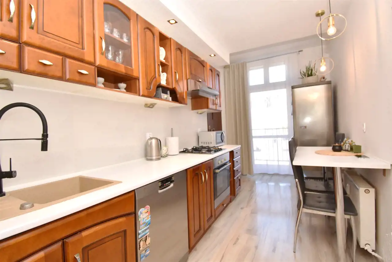 - osobna kuchnia z oknem i spiżarnią oraz wyjściem na drugi, przestronny balkon od strony podwórka - północna strona