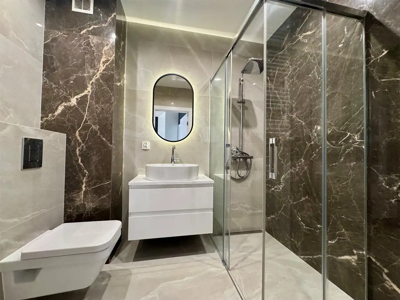 Łazienka z wc są spójne i utrzymane w jasnym, eleganckim charakterze.