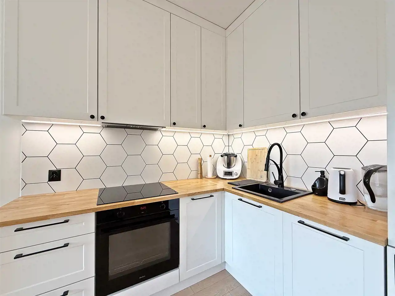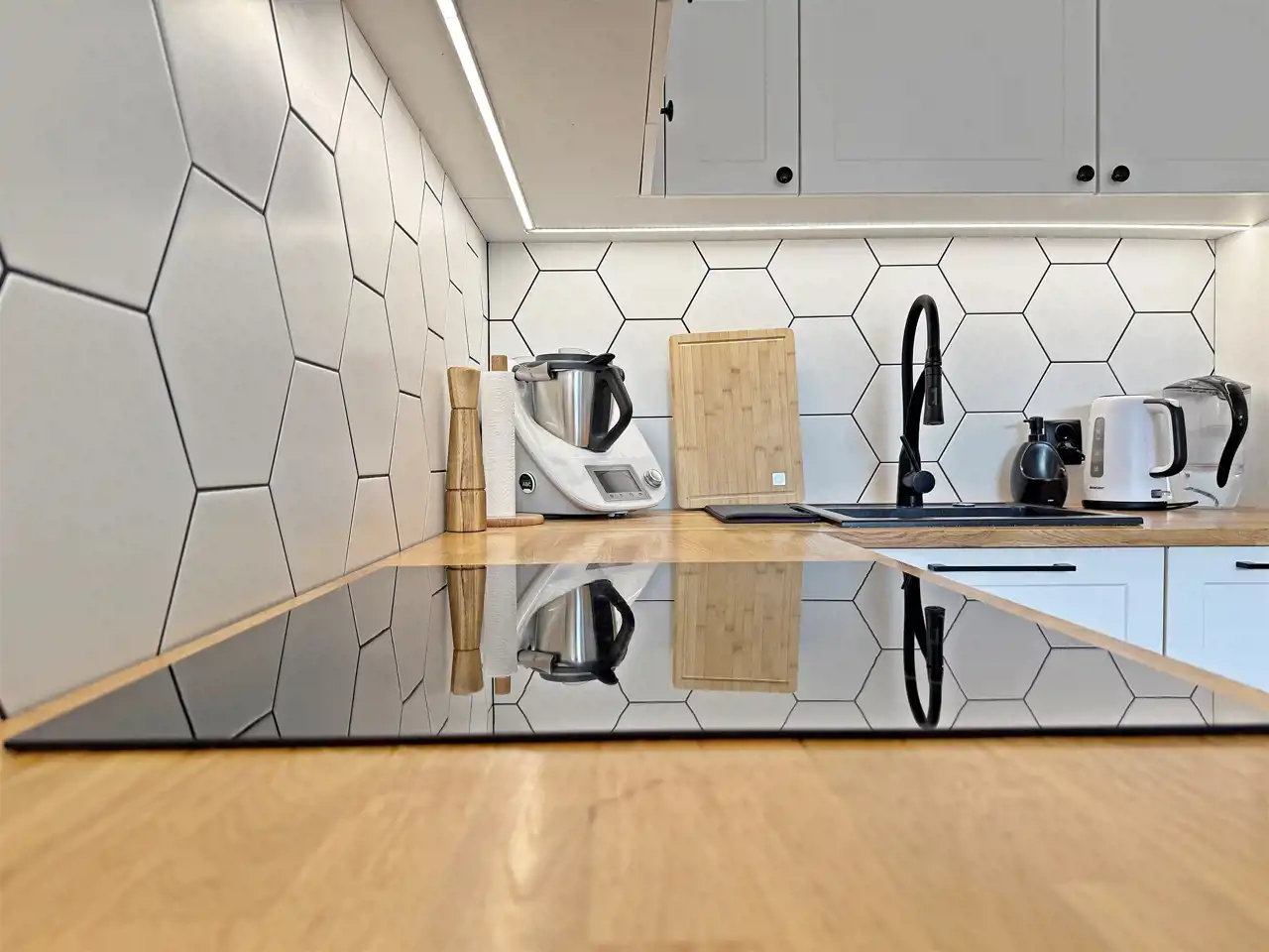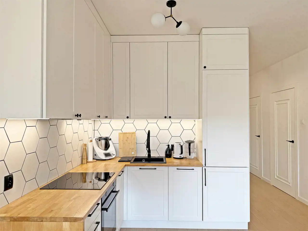– nowoczesna zabudowa kuchenna z pełnym AGD