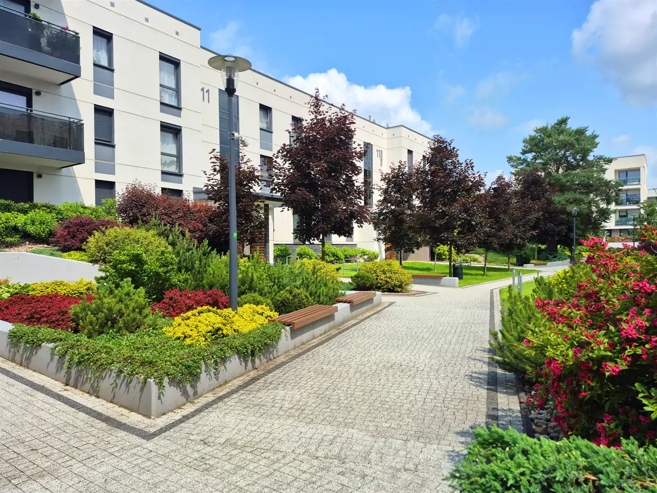 Jest to nowoczesny kompleks budynków mieszkalnych w niskiej zabudowie wielorodzinnej. Biała elewacja złamana antracytem z elementami drewna. Teren wokół został pięknie zagospodarowany, liczne nasadzenia przy alejkach. Deweloper zadbał o każdy element infrastruktury tej inwestycji.