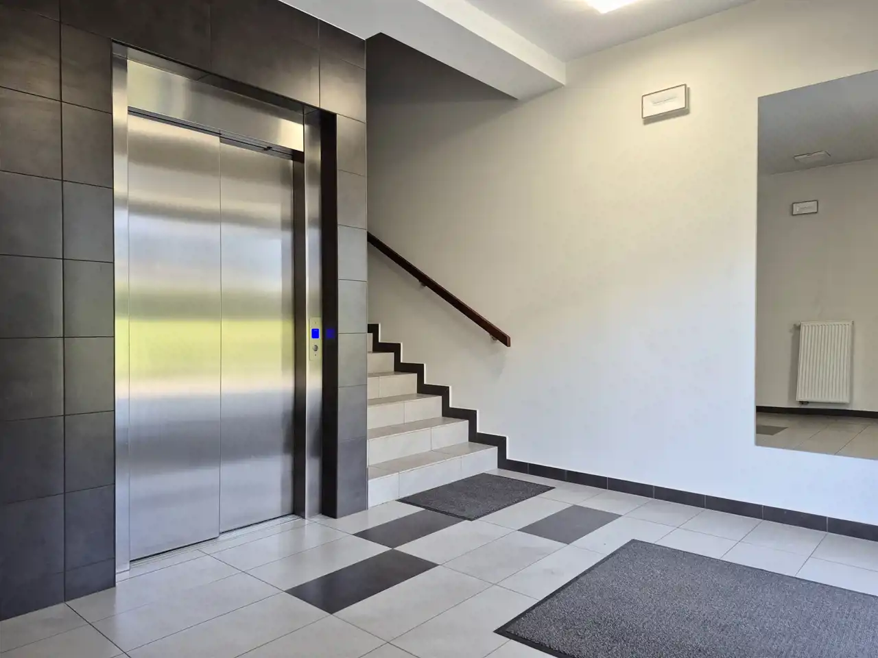 Kameralny blok, nowocześnie zaprojektowana, jasna klatka schodowa, schody niskie, winda z poziomu -1.