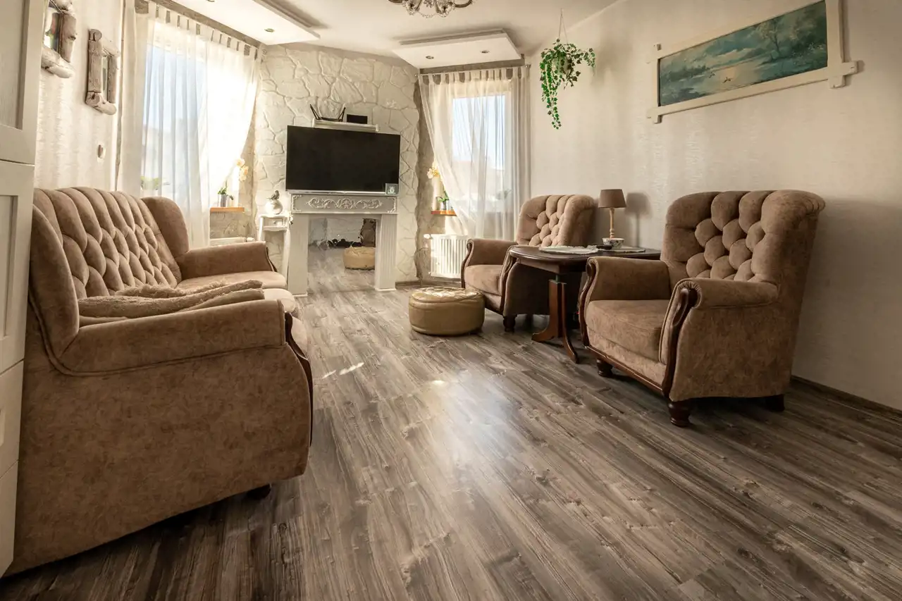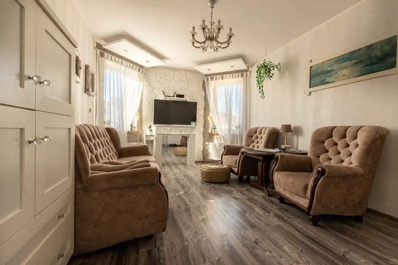 Wejście do mieszkania znajduje się w nowo dobudowanej części, po wejściu znajdujemy się w przestronnym holu z duża szafą w zabudowie. Na prawo 17,25m2 bardzo jasny pokój z oknami w stronę ogrodu.
