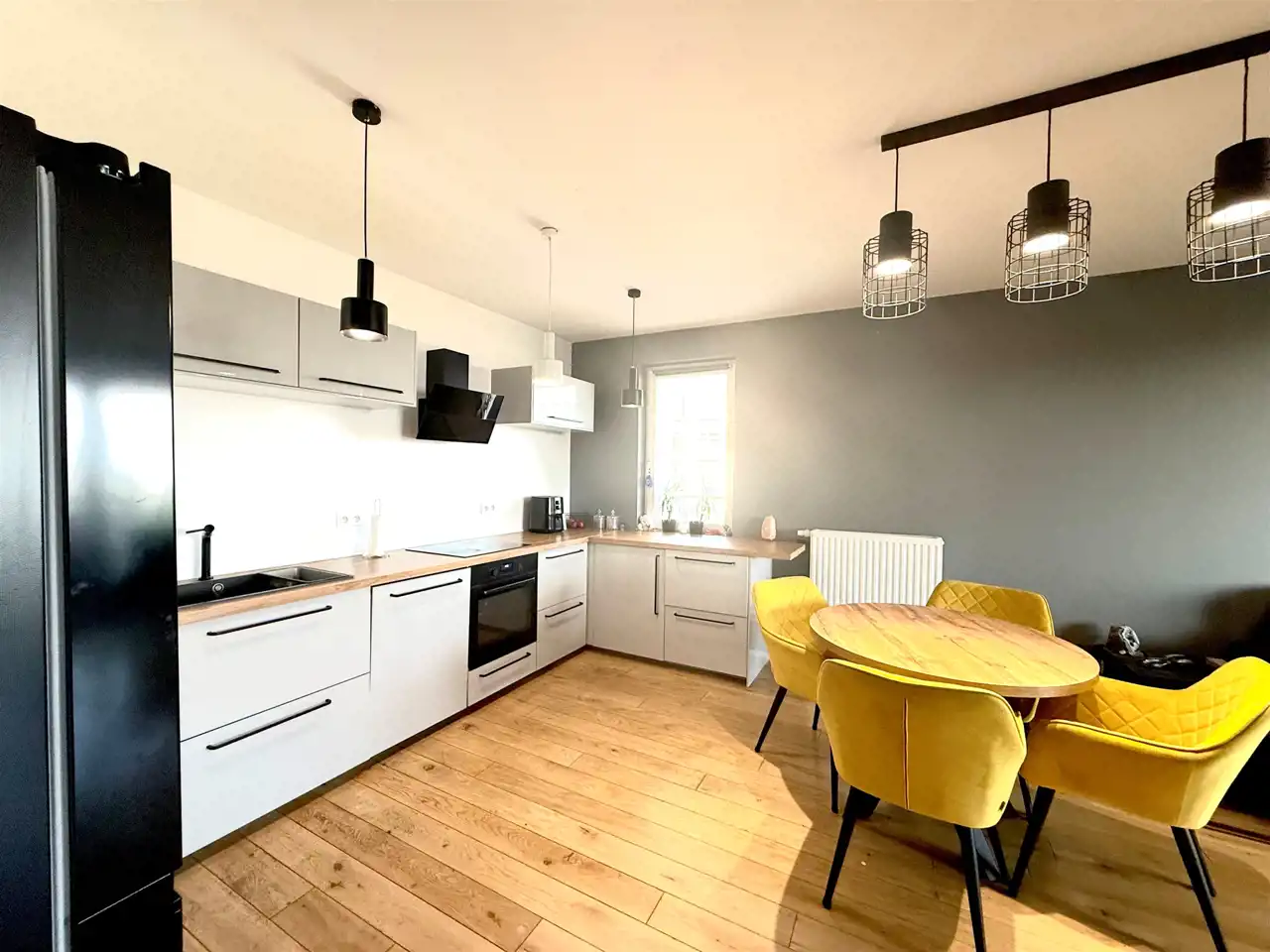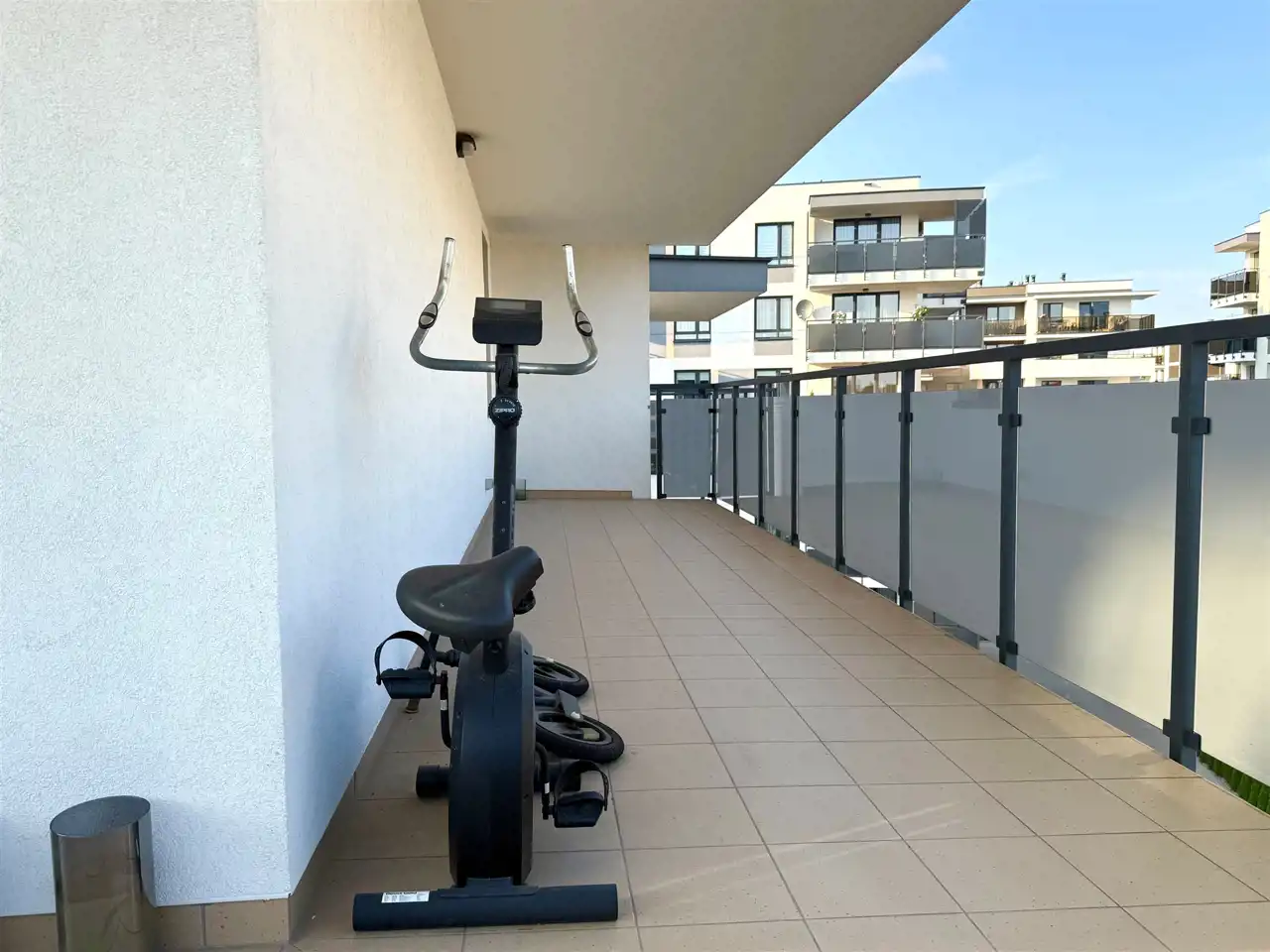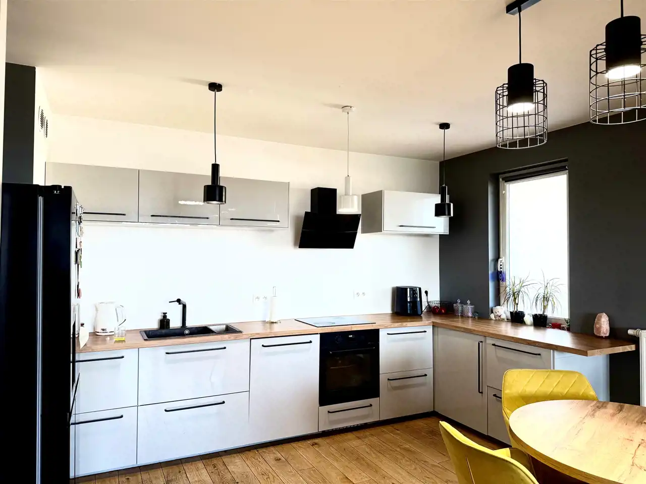 Na wszystkich ścianach gładzie, na podłogach wysokiej klasy ścieralności panele, nowoczesne oświetlenie. Aneks kuchenny zabudowany i wyposażony w piękną lodówkę, zmywarkę, okap i inne wyposażenie. W łazience kafelki na podłodze i ścianach, wyposażonej w kabinę, zabudowaną umywalkę z dużym, podświetlanym lustrem. W salonie duży stół wraz z krzesłami, TV, skórzana kanapa, fotel oraz szafka pod RTV. W sypialni rozkładana kanapa oraz zabudowana szafa. W drugiej sypialni garderoba oraz duże łóżko wraz z materacem oraz nową pościelą. Przedpokój wyposażony w siedzisko oraz podręczny zakątek na odzież wierzchnią. Z przedpokoju wejście do pomieszczenia na podręczne przedmioty, typu odkurzacz i środki czystości oraz pralnia wyposażona w podłączoną do sieci i instalacji, gotową do użytkowania pralkę automatyczną. W salonie w podłodze, przy drzwiach wyjściowych na taras znajduje się dodatkowe ogrzewanie, podpięte pod ogrzewanie CO, z dodatkowym sterowaniem elektronicznym. Wysokiej jakości drzwi wewnętrzne oraz doskonałe oświetlenia i podświetlenia we wszystkich pomieszczeniach. W całym mieszkaniu panele drewniane. Okna wyposażone w ładne rolety wewnętrzne.