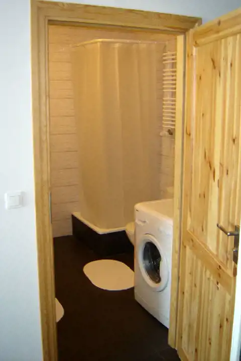 W łazience zainstalowano brodzik, WC, umywalkę i pralkę