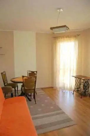 Znajduje się tutaj rozkładana kanapa, stół, krzesła, regał.