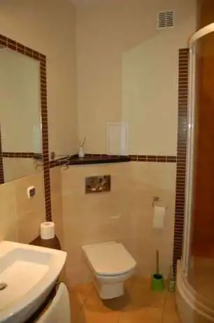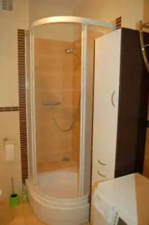 Łazienka w glazurze i terakocie wyposażona w kabinę prysznicową. Znajduje się tutaj pralka.