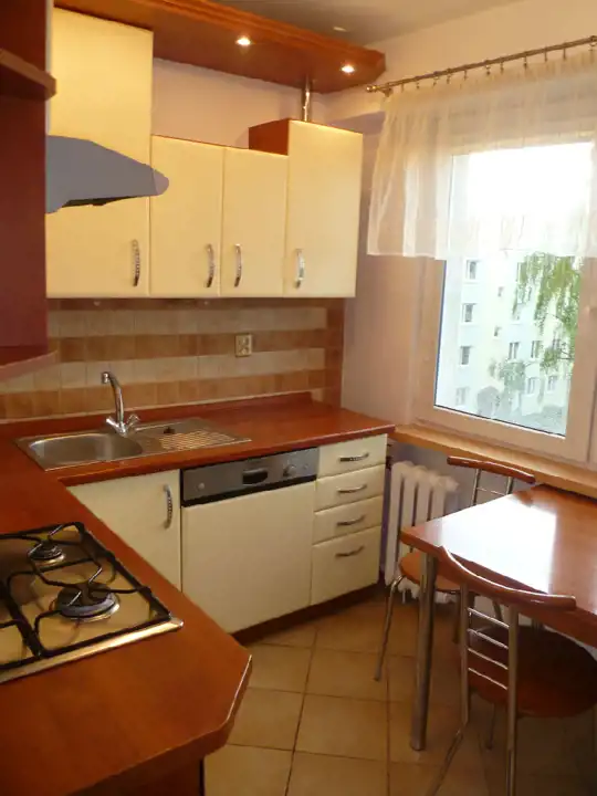 Mieszkanie jest całkowicie UMEBLOWANE I WYPOSAŻONE. W salonie kanapa, stół, telewizor. Sypialnia wyposażona w duże łóżko i obszerną szafę typu KOMANDOR. W trzecim pokoju biurko i szafki. Kuchnia w zabudowie, wyposażona w sprzęt AGD: lodówkę, zmywarkę, piekarnik elektryczny z płytą gazową. W łazience znajduje się pralka.