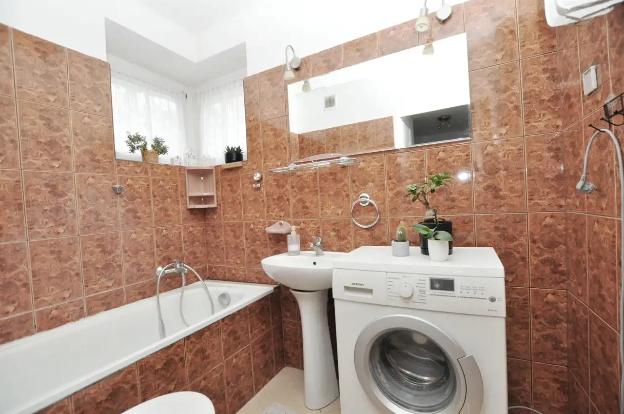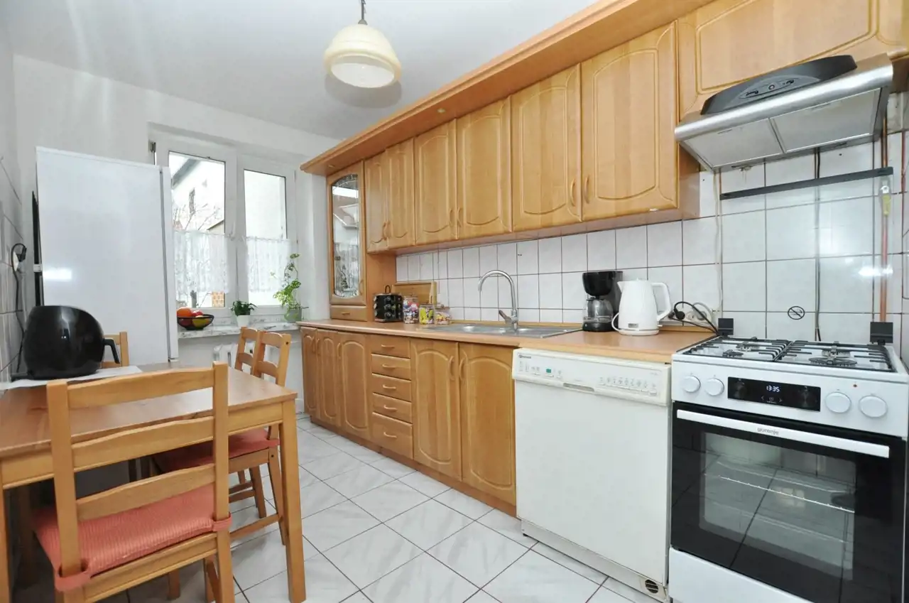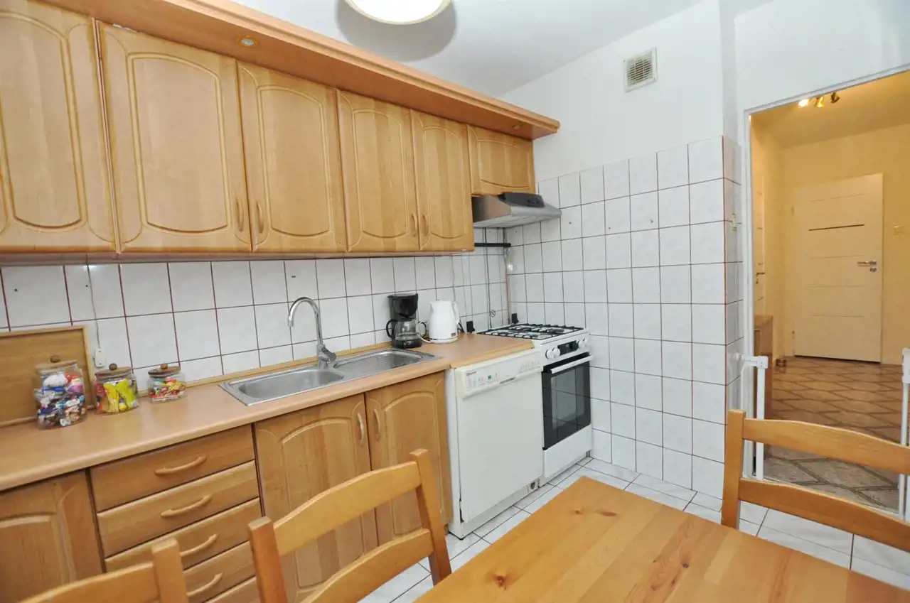 - w wyposażeniu m.in. lodówka z zamrażarką, zmywarka, pralka, TV