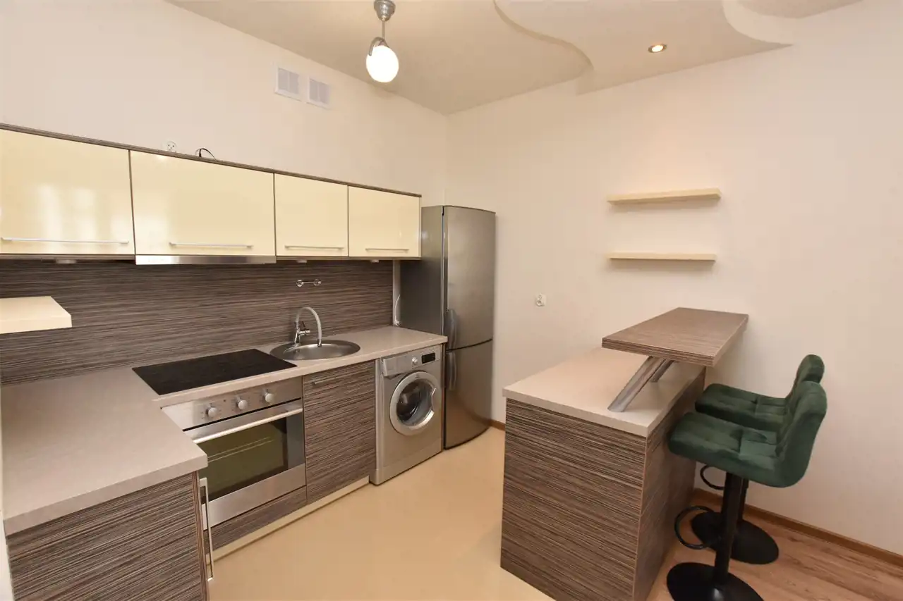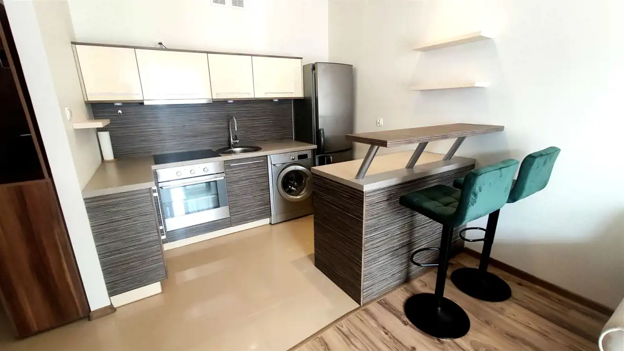 W pokojach na ścianach gładzie, na podłodze panele podłogowe. W salonie uroku dodają stylowe zabudowy sufitu z oryginalnym oświetleniem - na jednej ze ścian kamień ozdobny. W aneksie kuchennym zabudowa kuchenna z płytą i piekarnikiem. W łazience nowoczesna glazura i terakota.