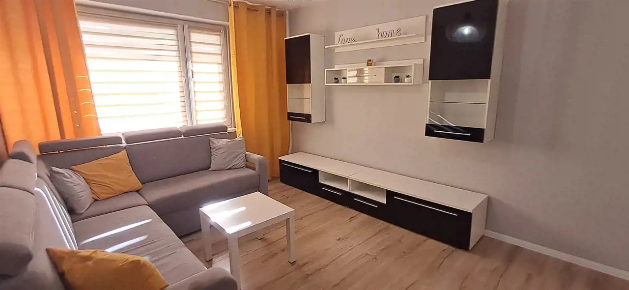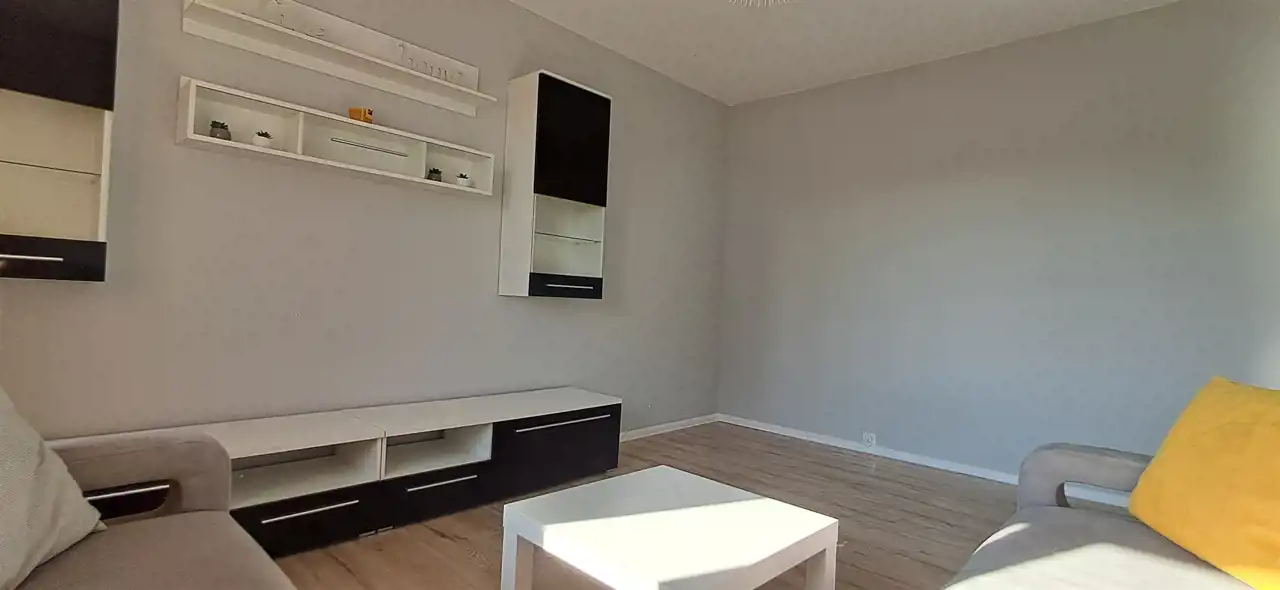 Jeden pokój z rozkładaną kanapą-narożnikiem, duża szafa (ie widac na foto, nowa w kolorze białym 3 drzwiowa). W drugim pokoju pojedyńcze łóżko drewniane, komoda(nie widać na foto, nowe).