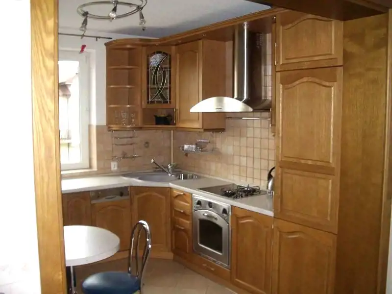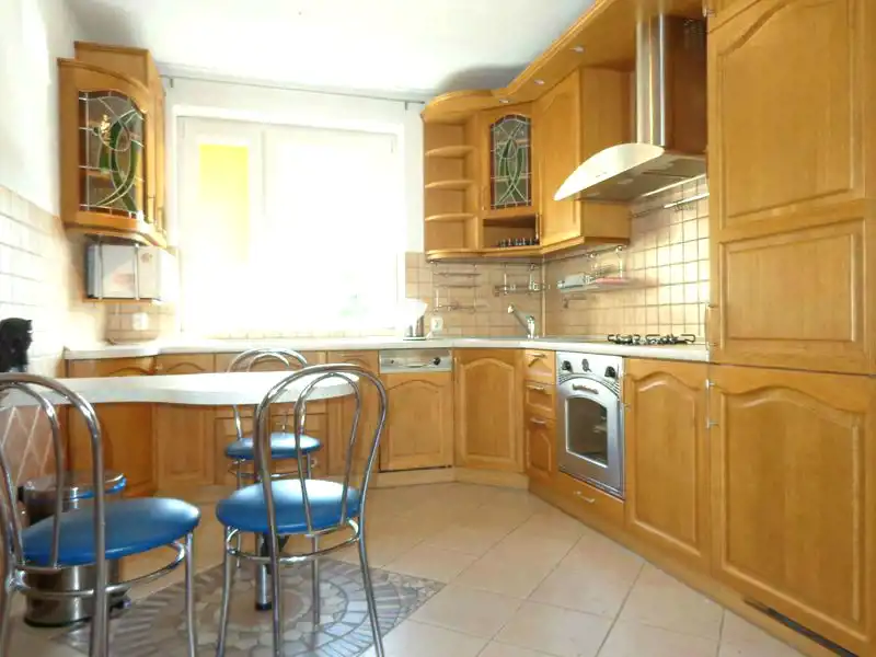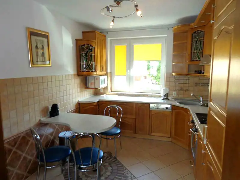 W kuchni obszerna zabudowa, stolik, lodówko-zamrażarka, zmywarka, piekarnik z płytą gazową, kuchenka mikrofalowa.