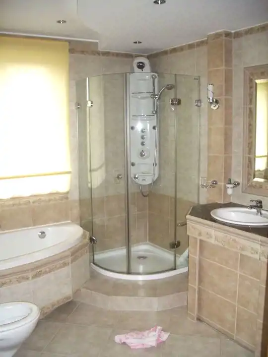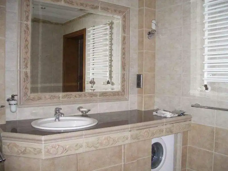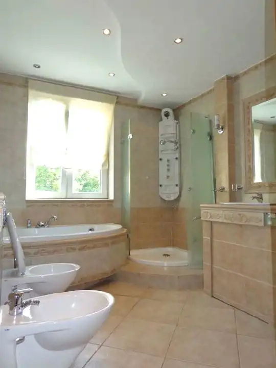 Łazienka z WANNĄ, NATRYSKIEM, WC I BIDETEM, wyposażona w pralkę.