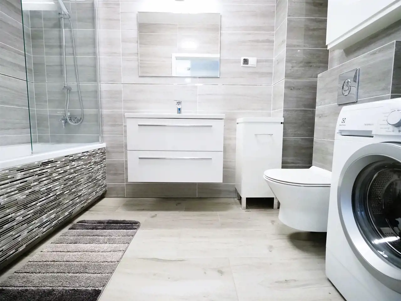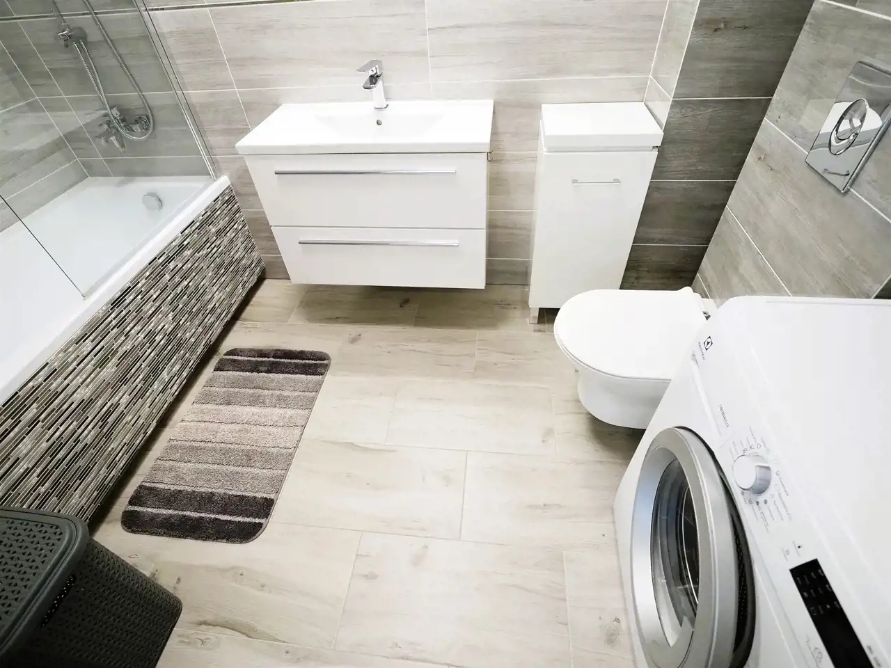 W łazience pralka oraz prysznic.