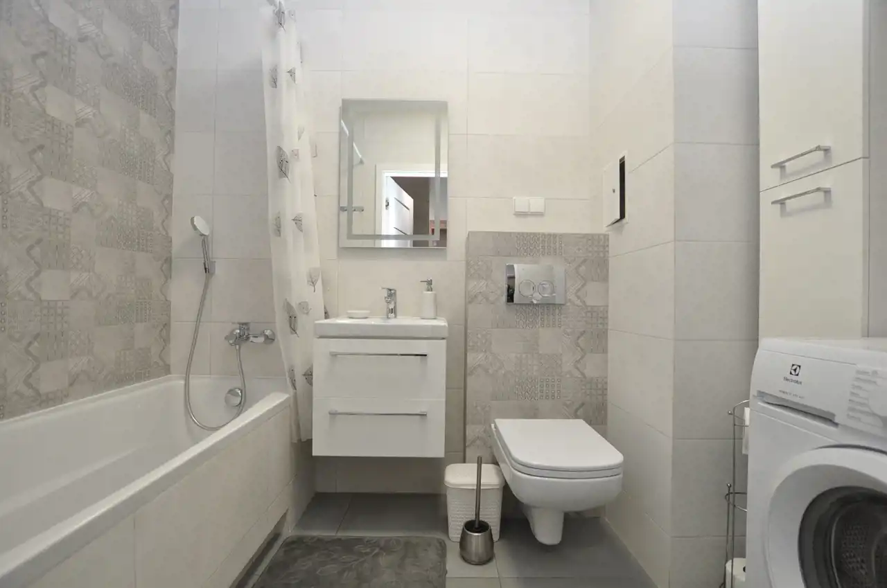 -w wyposażeniu: pralka, duża lodówka z zamrażarką, zmywarka, odkurzacz akumulatorowy, deska do prasowania, żelasko