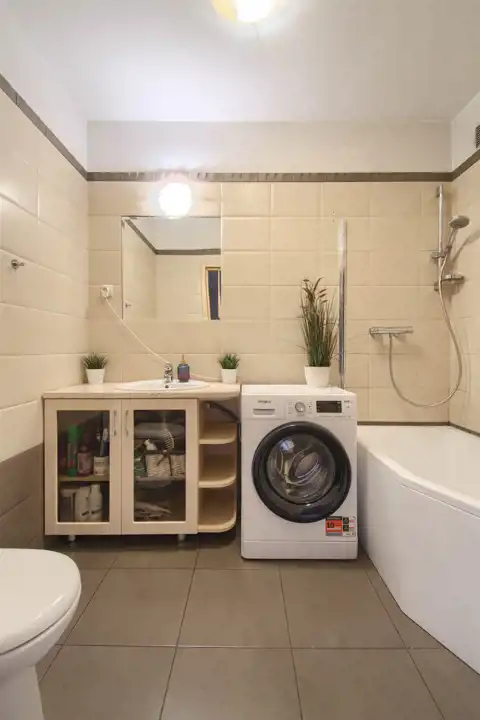 Łazienka - szafka z umywalką, wanna, pralka, WC