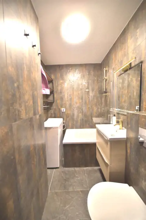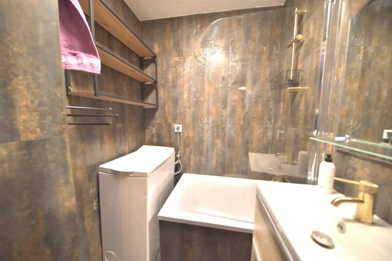 - łazienka z wanną i pralką