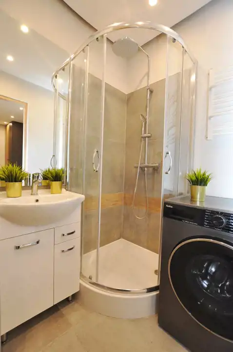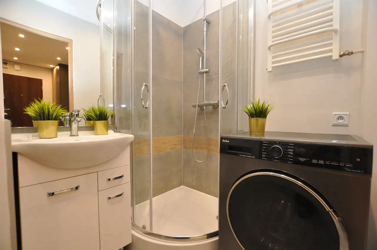 - łazienka z kabiną prysznicową, pralką