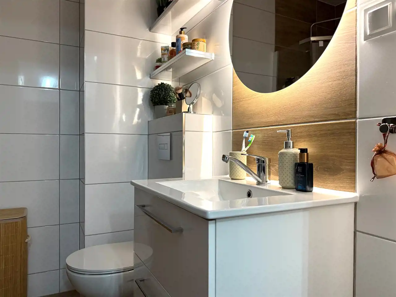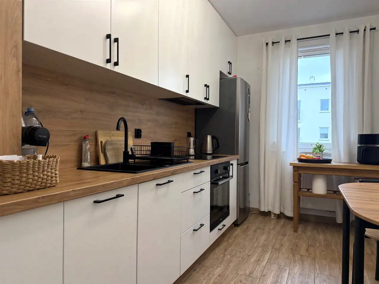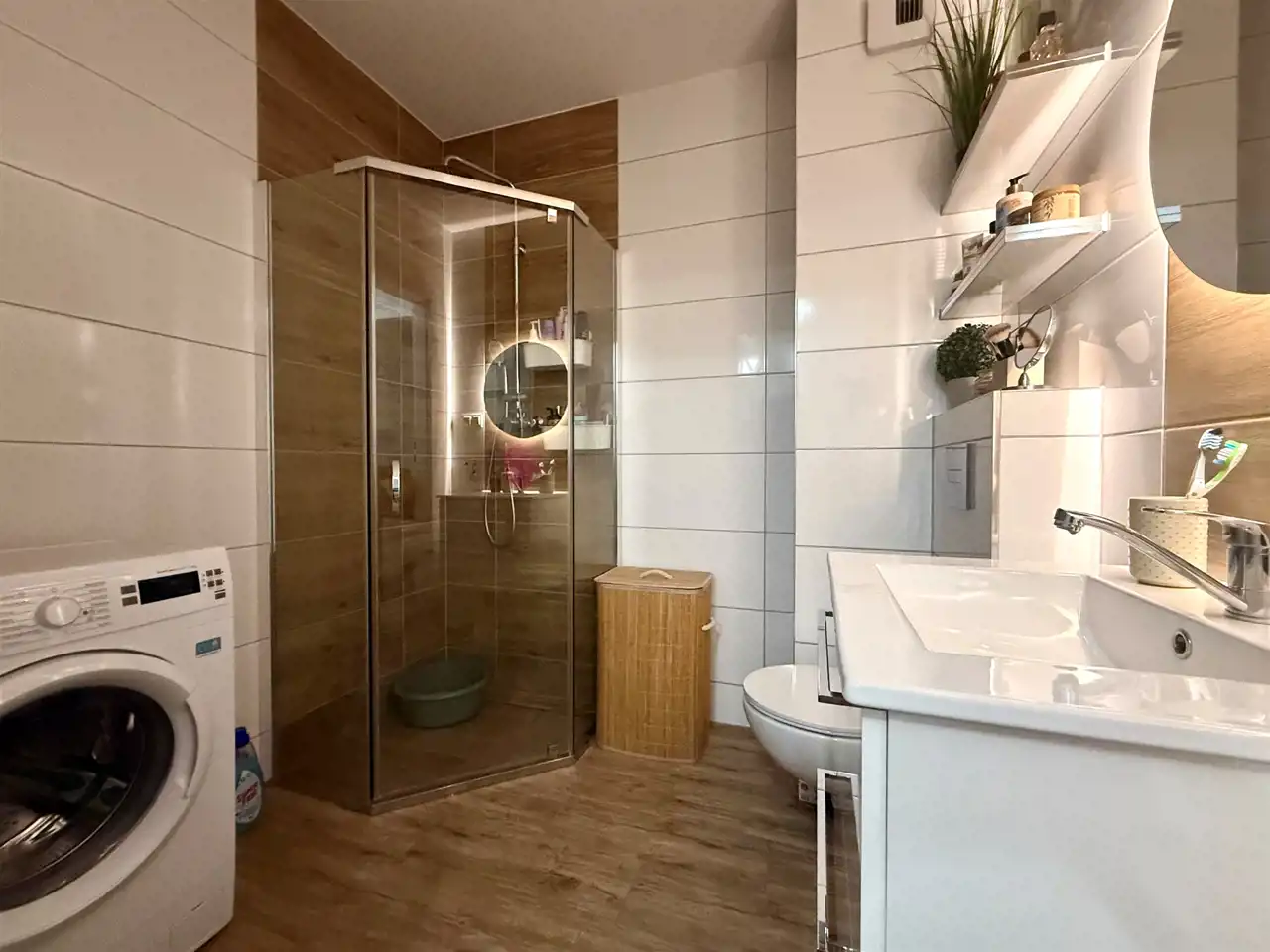 Bardzo ładnie zaaranżowana i zabudowana kuchnia z pełnym, nowym wyposażeniem: lodówka dwukomorowa, płyta indukcyjna, piekarnik, zmywarka, okap itp. Łazienka wyposażona w kabinę z prysznicem i deszczownicą, ładną szafką pod umywalkę z baterią, pralką automatyczną, podłoga i ściany w kaflach. Podłoga w kuchni i przedpokoju w kaflach drewnopodobnych