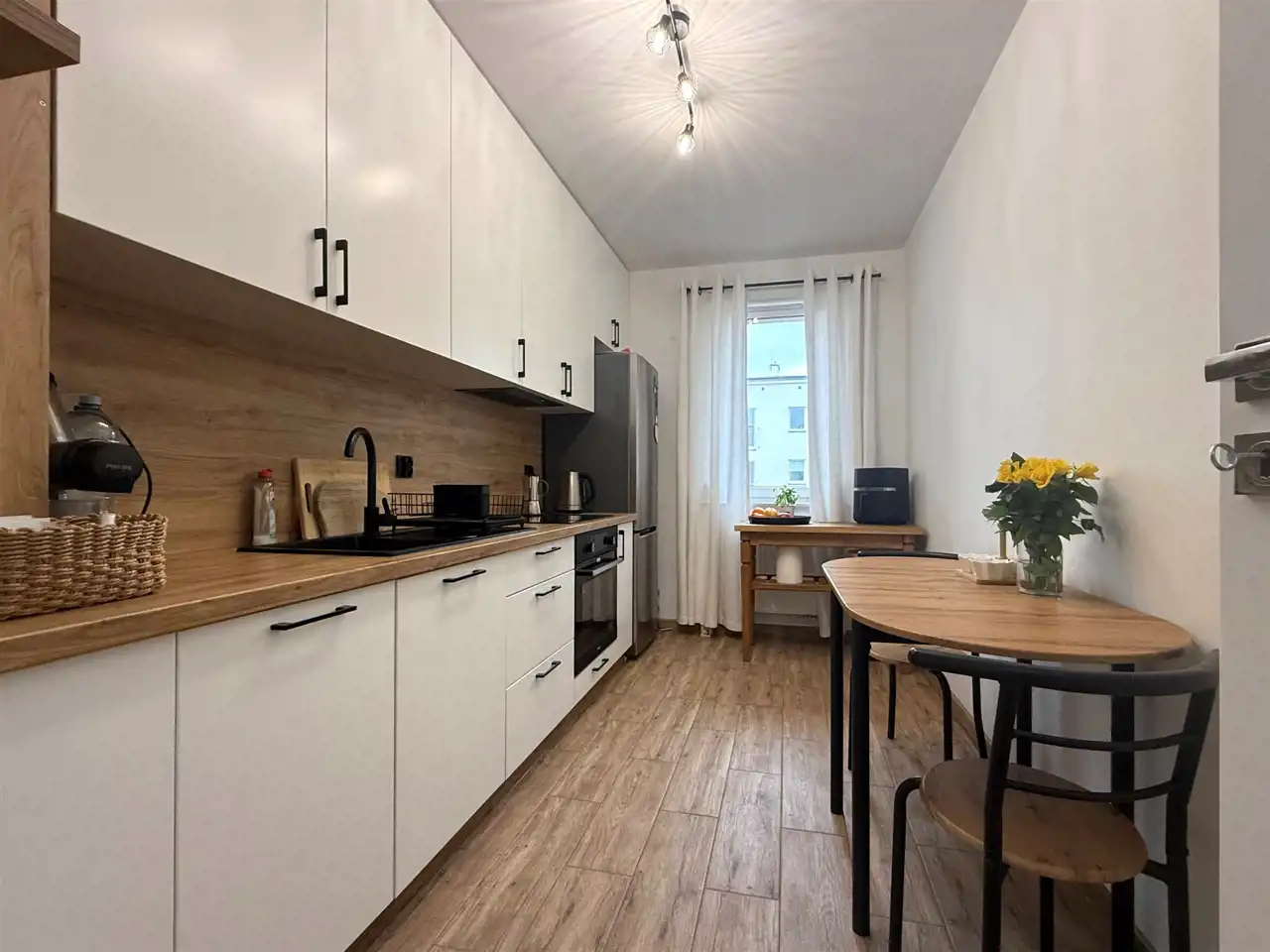 Nowocześnie zaaranżowany i wyposażony lokal mieszkalny, wraz z umeblowaniem i wyposażeniem pokoju dziennego, kuchni w zabudowie, łazienki oraz przedpokoju.