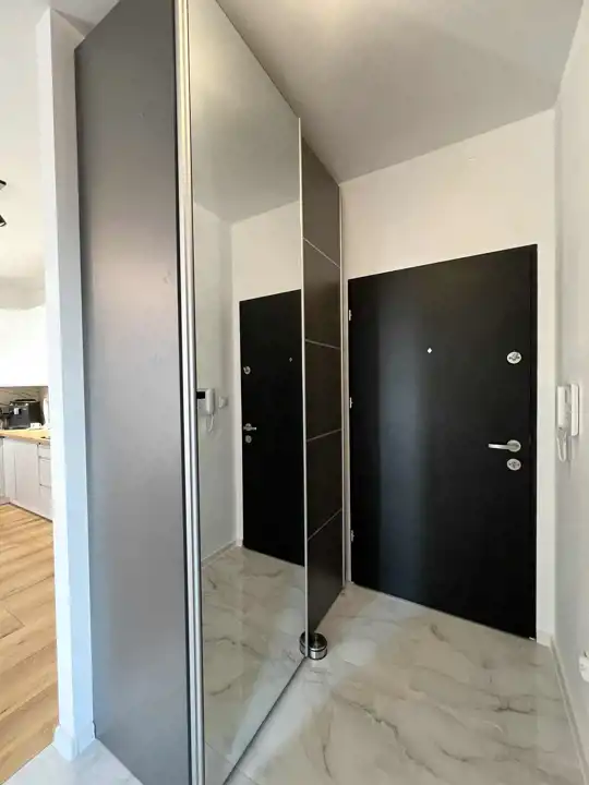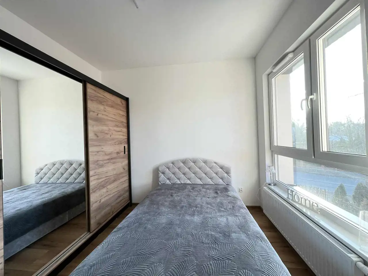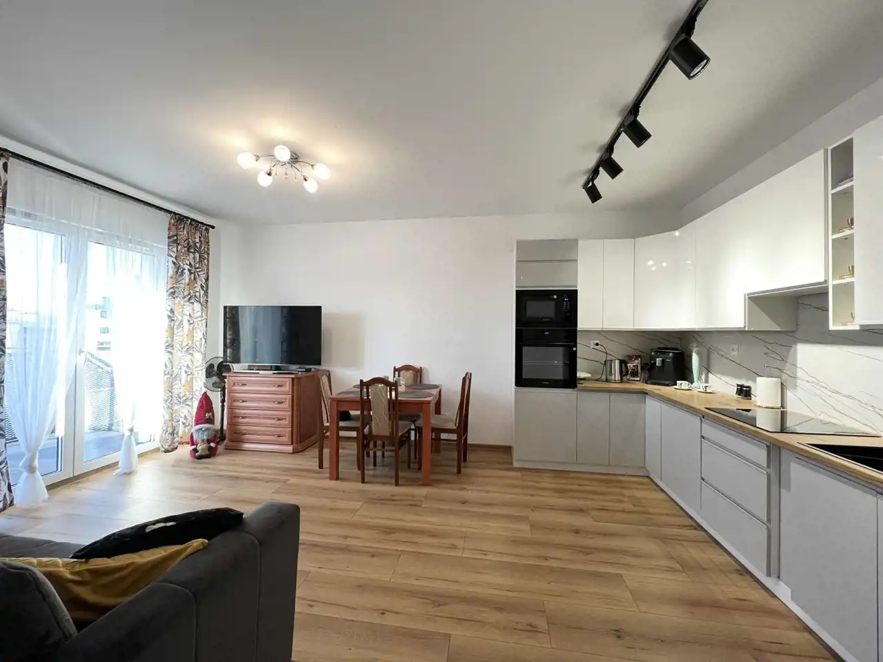 Mieszkanie kompletnie wyposażone ( naczynia, deska do prasowania, odkurzacz, żelazko). Nowoczesna zabudowa kucheni ze sprzętem AGD (lodówka, zmywarka, piekarnik, płyta, okap, ekspres do kawy). W sypialni i przedpokoju pojemne szafy.