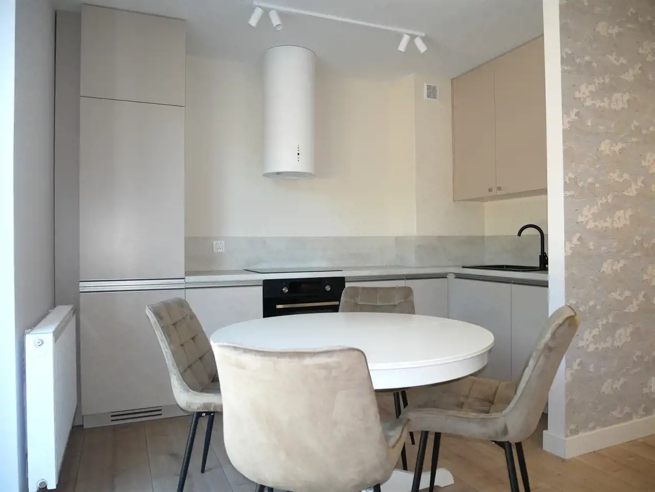 Mieszkanie częściowo umeblowane, m.in. kuchnia wyposażona w meble na wymiar oraz kompletne wyposażenie, w tym lodówka, kuchenka indukcyjna, piekarnik, zmywarka itp.