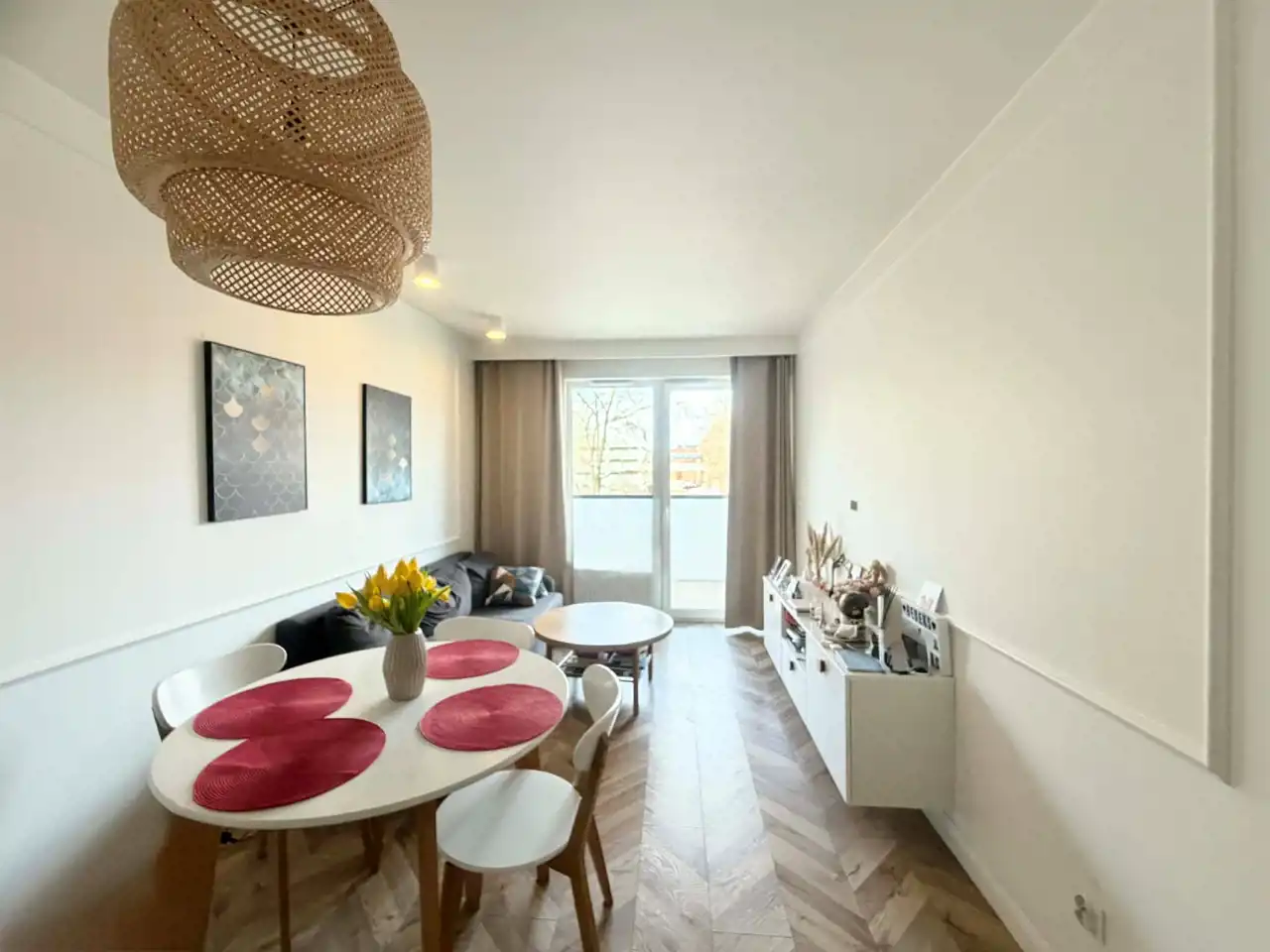 Mieszkanie jest kompletnie umeblowane i wyposażone we wszystkie niezbędne sprzęty, co pozwala na wprowadzenie się bez dodatkowych nakładów. Kuchnia jest w pełni wyposażona we wszystkie niezbędne sprzęty AGD ( zmywarka, piekarnik, płyta, lodówka) , co zapewnia wygodę i funkcjonalność podczas codziennego użytkowania.Dodatkowym atutem jest balkon, idealny do relaksu i odpoczynku. Rolety zewnętrzne w salonie i sypialni.