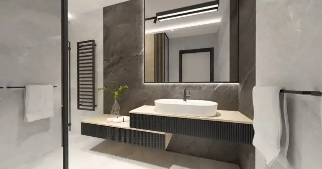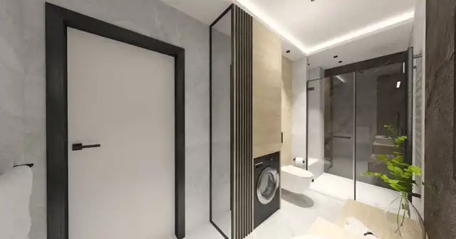 Łazienka - pralka , szafka łazienkowa , prysznic z brodzikiem walk-in, dywanik , szczotka łazienkowa , komplet mydelniczka kubek, lustro , kinkiet , toaleta, lampa sufitowa