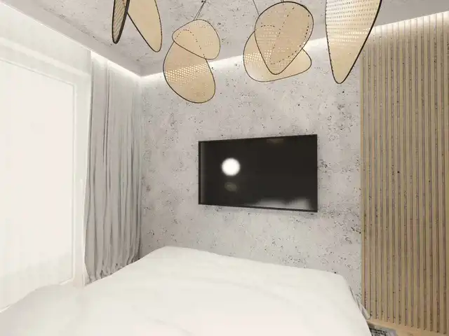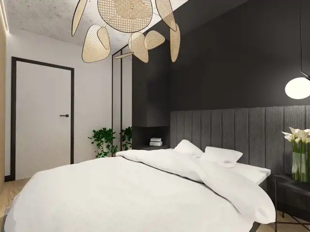 Sypialnia - łóżko 160x200 z materacem , panele ścienne , lamele ozdobne , komplet pościeli , szafa zabudowa , lampka nocna , lampa wisząca , stolik nocny , wieszaki , zasłony , panele podłogowe