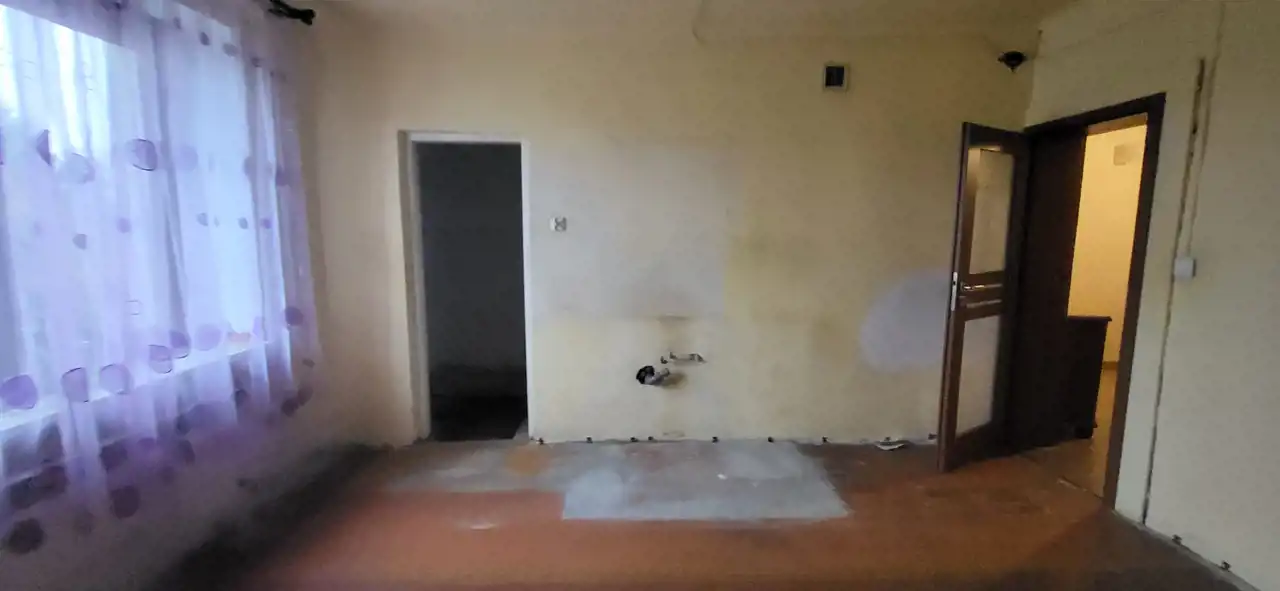PARTER: do remontu - pokój 14,50 m2; kuchnia 20,50 m2 ze spiżarką 3,40m2 oraz łazienka 3,30m2.