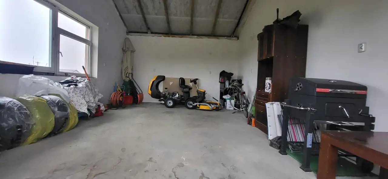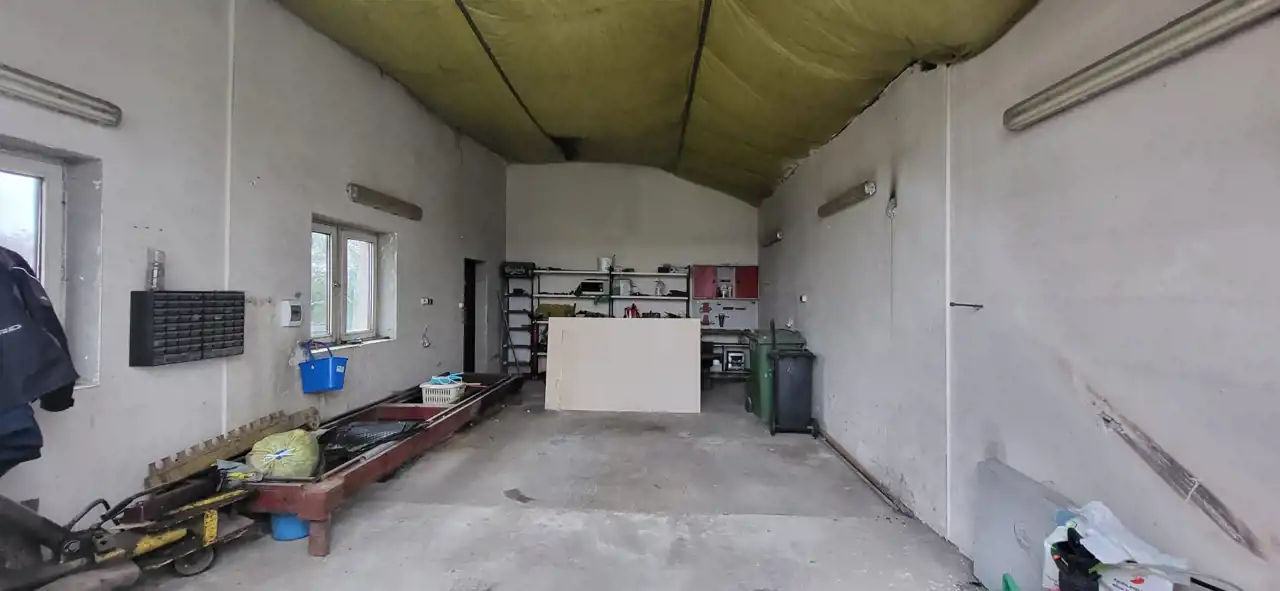 Działka ma powierzchnię 5000 m2 i oprócz domu jest tu także murowany budynek z dwoma garażami: