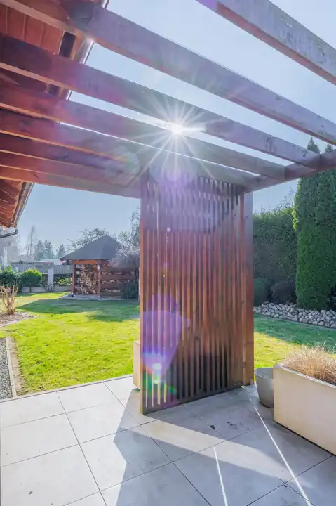 Wiata na sprzęty ogrodowe, a także praktyczne miejsce na przechowywanie drewna kominkowego.