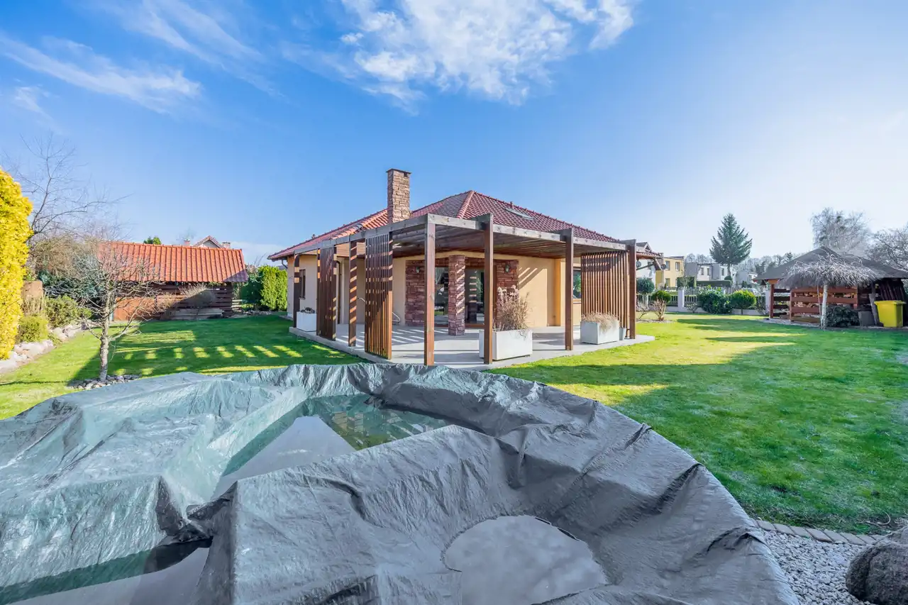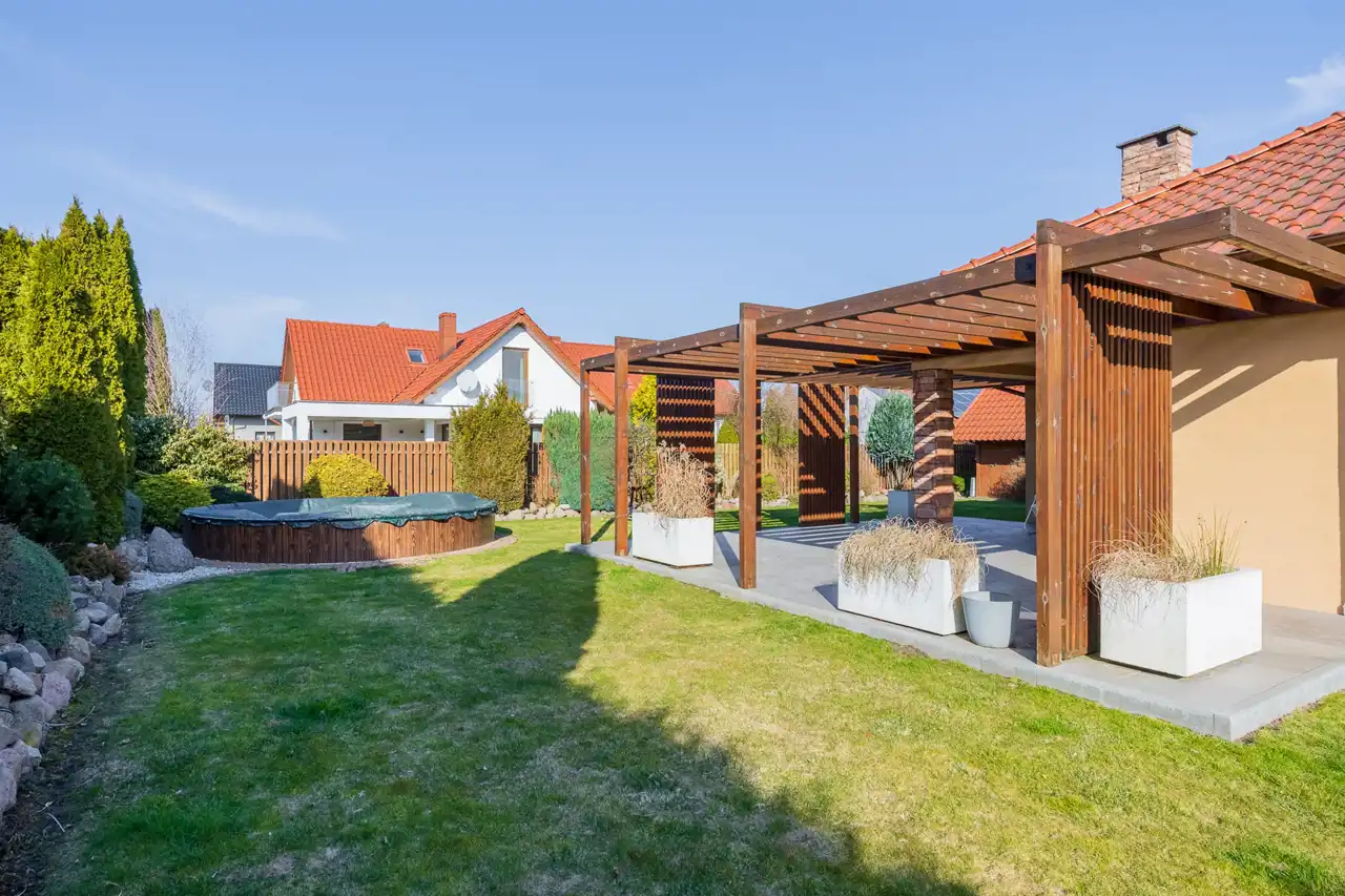 Basen ogrodowy, położony w pobliżu tarasu, stanowi nieocenioną wartość w czasie letnich upałów – idealne miejsce na zabawę z dziećmi lub spokojne popołudnie w gronie przyjaciół.