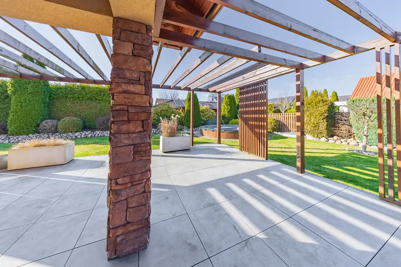 Nowoczesny taras, który łączy funkcjonalność z estetyką, doskonały do rodzinnych spotkań i relaksu.