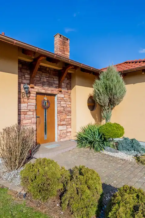 Estetyczne ogrodzenie oraz starannie zaprojektowana przestrzeń przed domem, która umożliwia wygodne parkowanie nawet dla kilku samochodów.