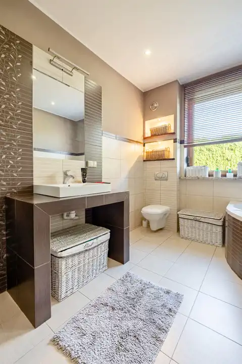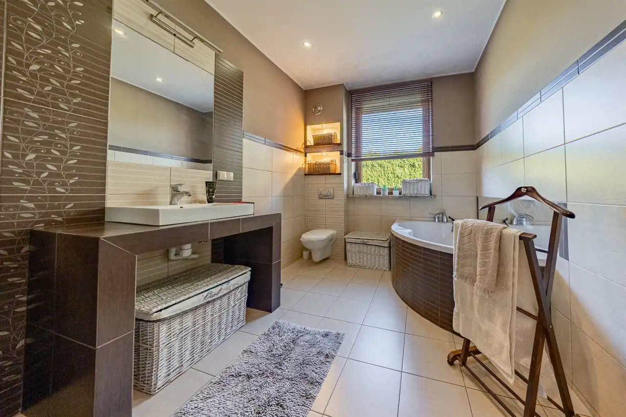 Łazienka z oknem, urządzona z dbałością o detale, przestronna i funkcjonalna.