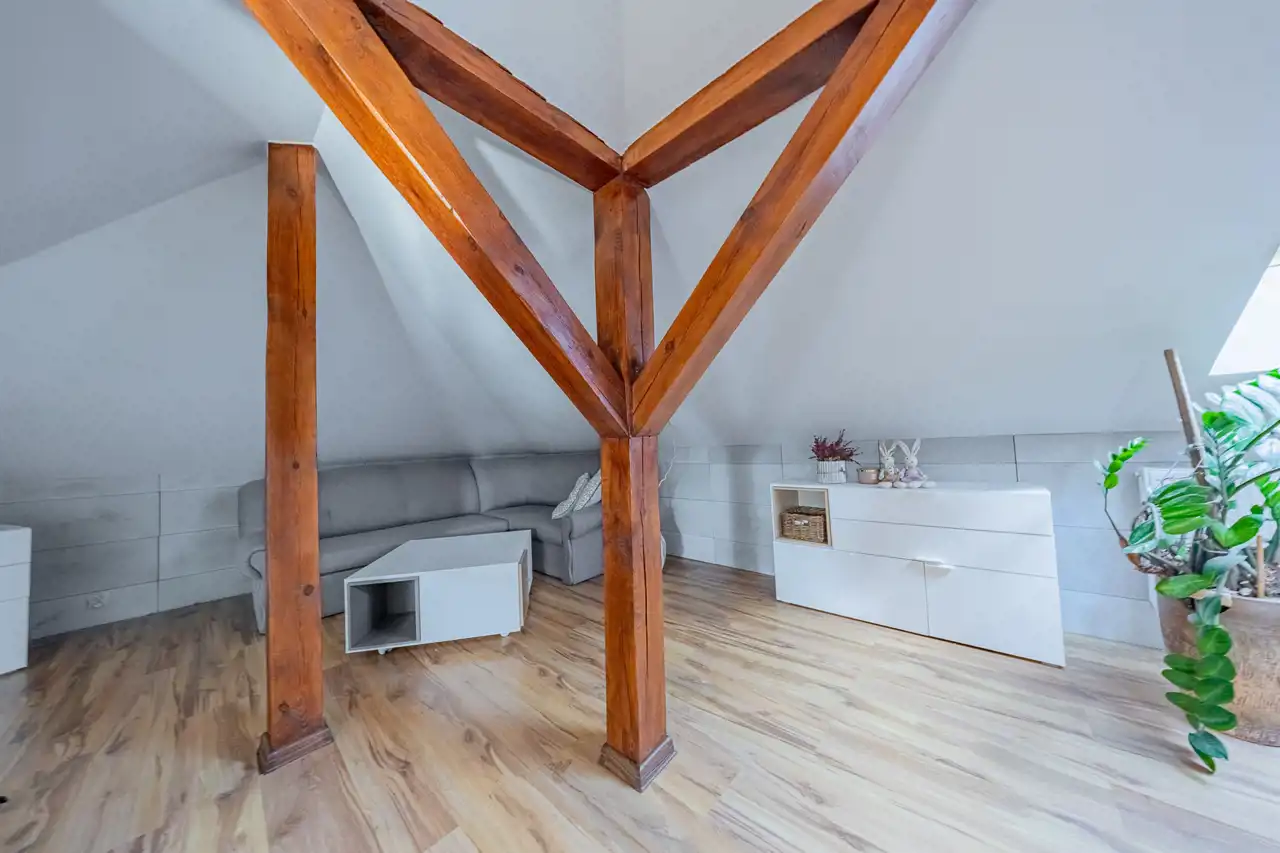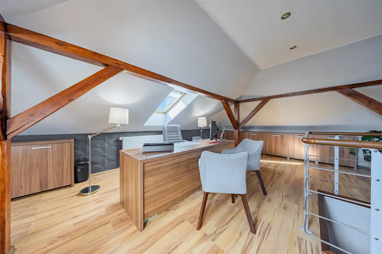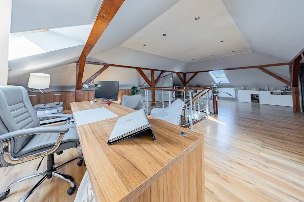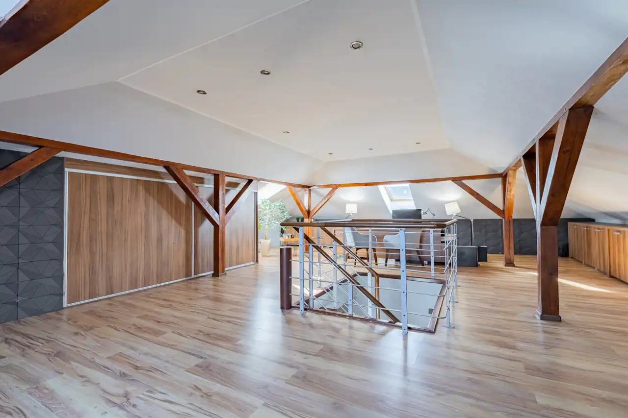 Antresola, która pełni rolę wielofunkcyjnej przestrzeni. Dzięki dużym oknom, to miejsce jest wyjątkowo jasne, które może pełnić funkcję open space, biura, pokóju zabaw dla dzieci lub dodatkową przestrzeń rekreacyjną.