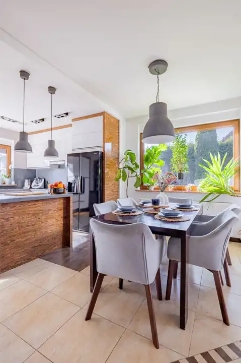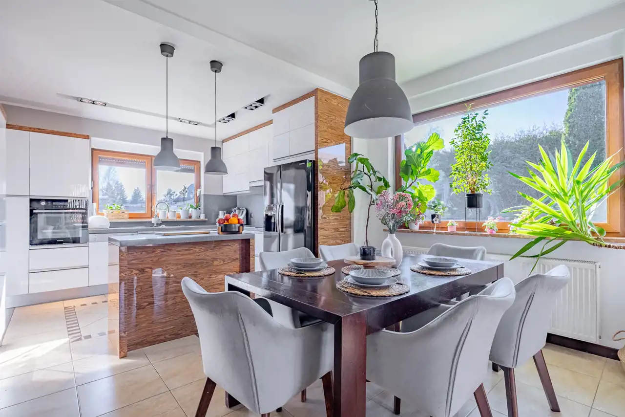 Jadalnia z panoramicznym oknem, które pozwala na podziwianie widoków podczas wspólnych posiłków.