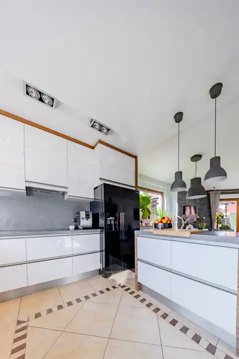 Kuchnia otwarta na jadalnię i salon, wyposażona w nowoczesną wyspę kuchenną. Duże okna zapewniają mnóstwo naturalnego światła, tworząc jasną i przyjazną przestrzeń.