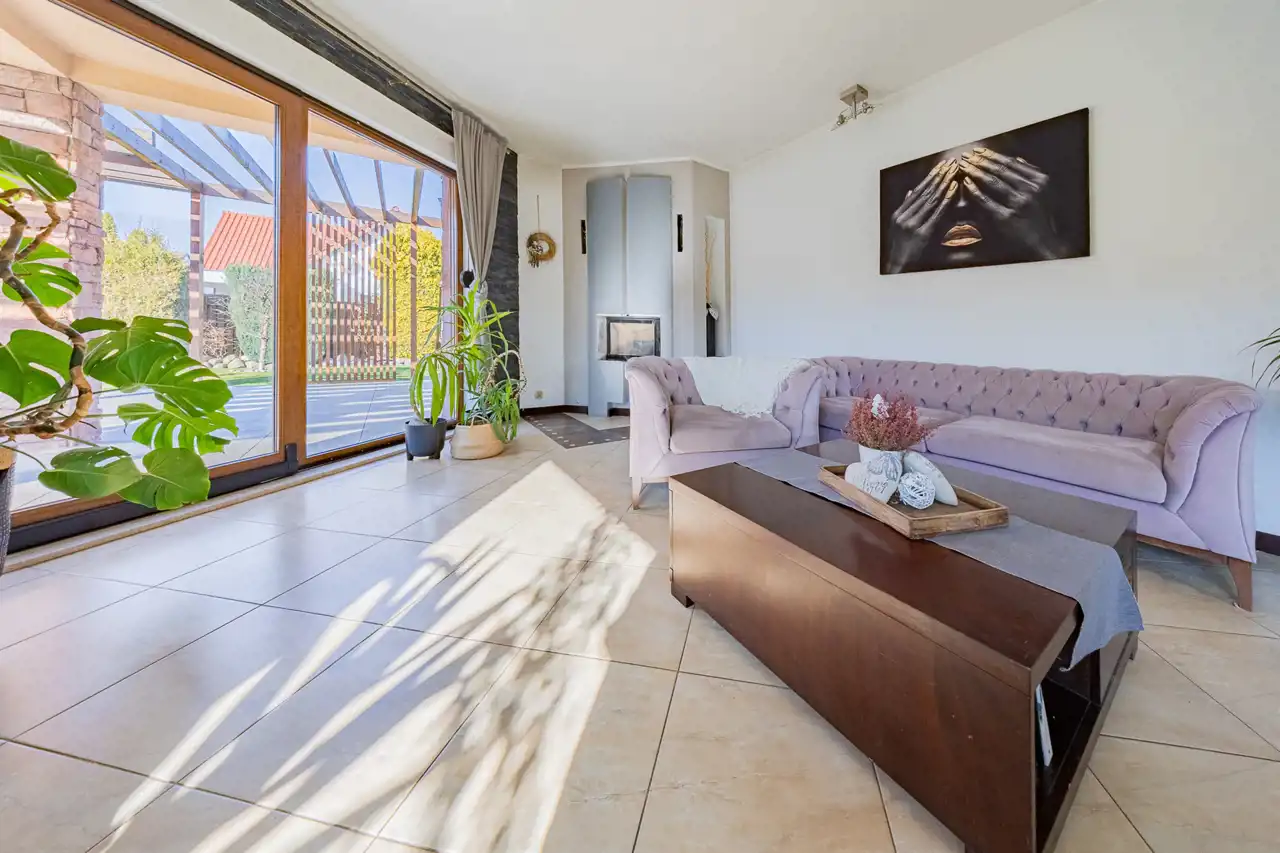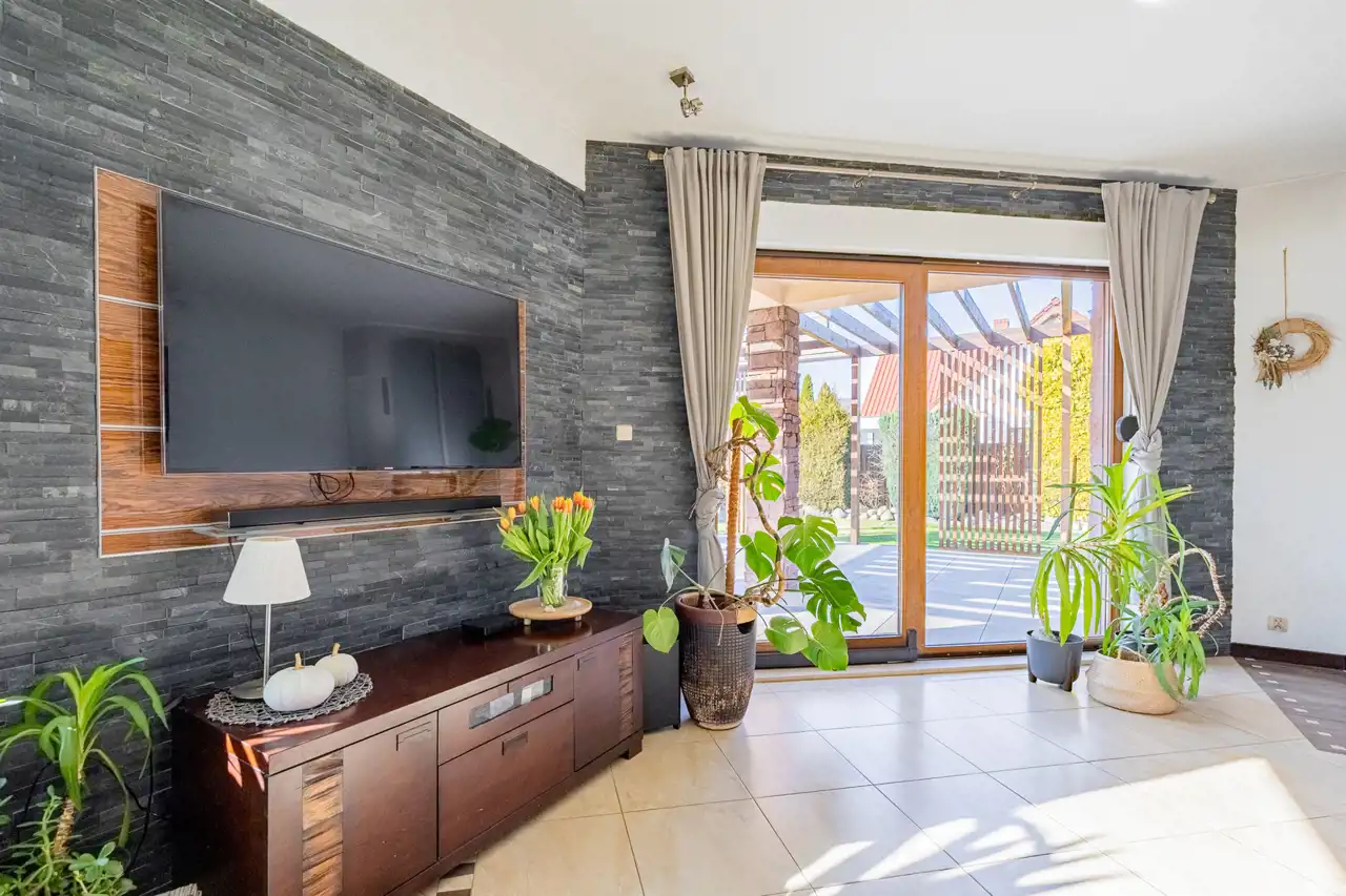 Przestronny salon z przesuwnym oknem prowadzącym na taras oraz stylowym kominkiem – idealny na chłodne wieczory, zapewnia dodatkowe źródło ciepła i niezapomniany klimat.