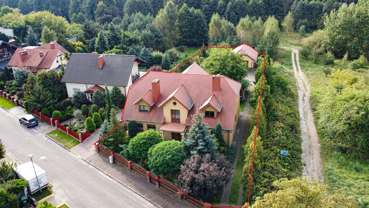 Działka o powierzchni 1241 m2 w pełni zagospodarowana z różnorodnymi nasadzeniami na której położony jest dom piętrowy z pełnym podpiwniczeniem.