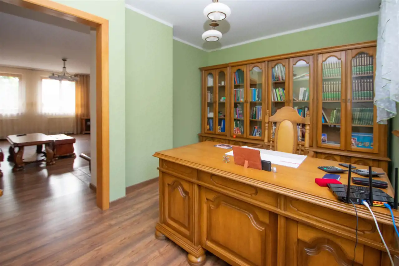 - biura z solidnym drewnianym biurkiem oraz drewnianą witryną o powierzchni 12,6m2