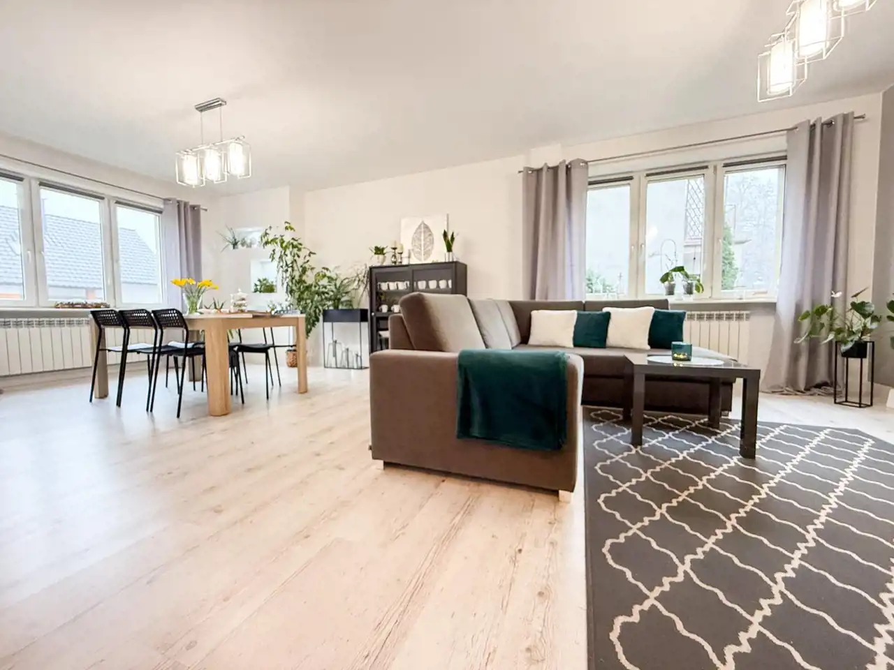 Przestronny salon z miejscem na wspólne wieczory, nowoczesna kuchnia gotowa do kulinarnych eksperymentów,