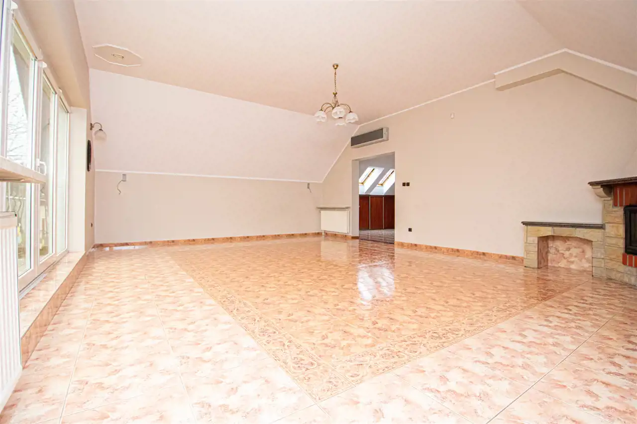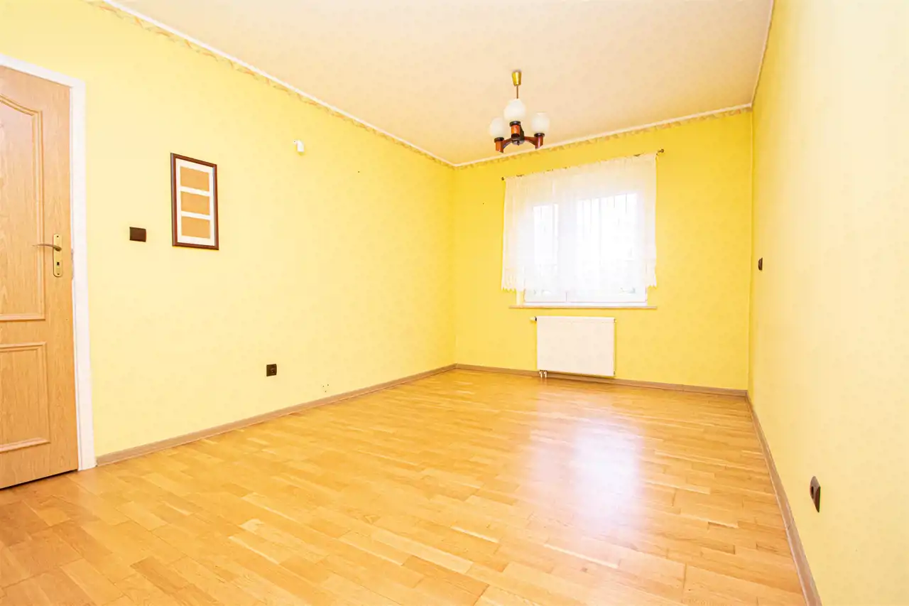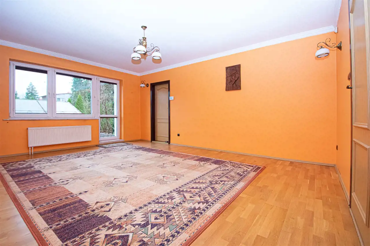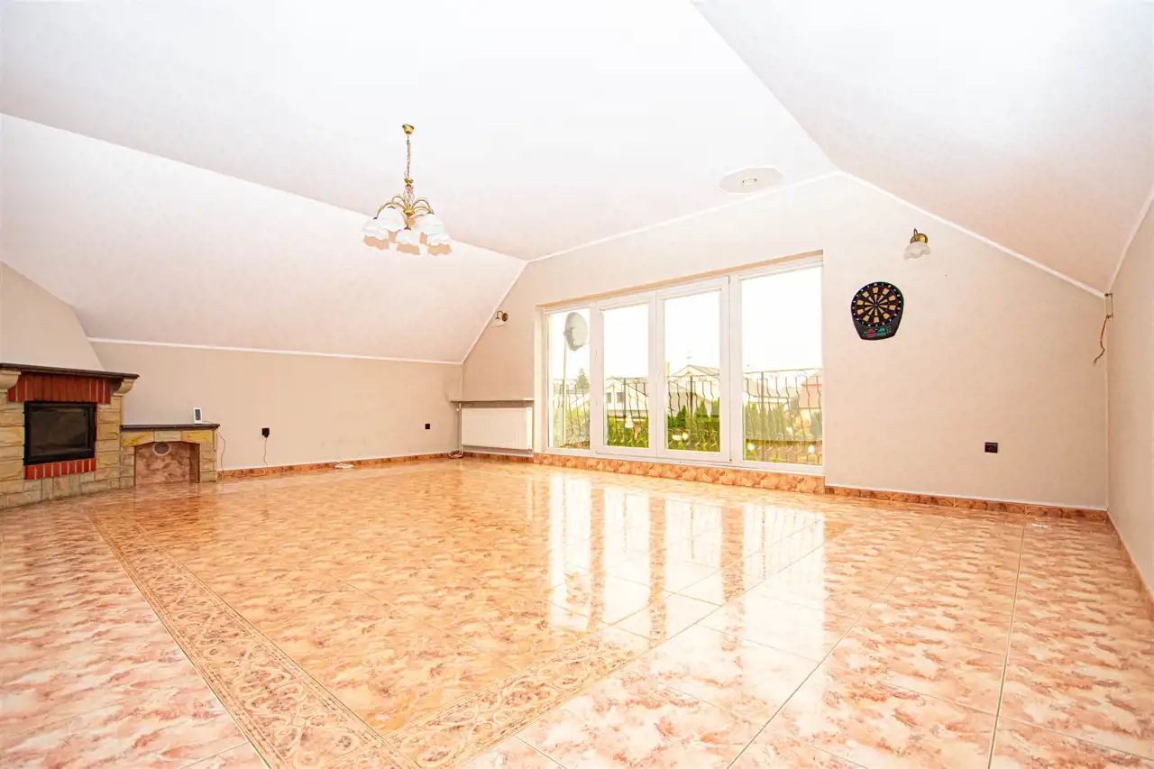 • Funkcjonalność i przestronność: Dom składa się z dwóch kondygnacji, co zapewnia optymalny układ pomieszczeń dla dużej rodziny. Na parterze znajduje się 5 pokoi z deską berlinecką na podłogach, garderoba oraz łazienka, a na piętrze dodatkowy przestronny salon, duża łazienka z jacuzzi oraz kuchnia z jadalnia.