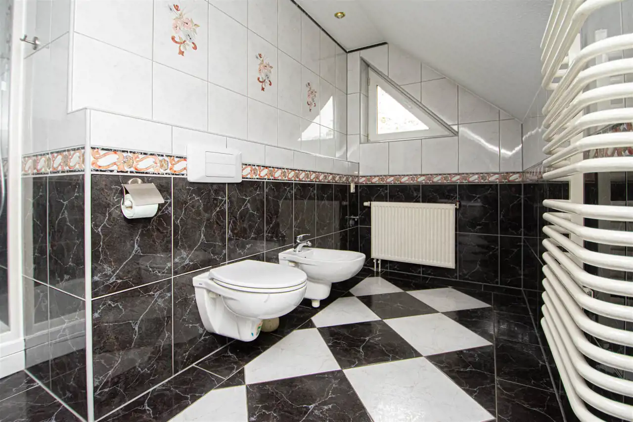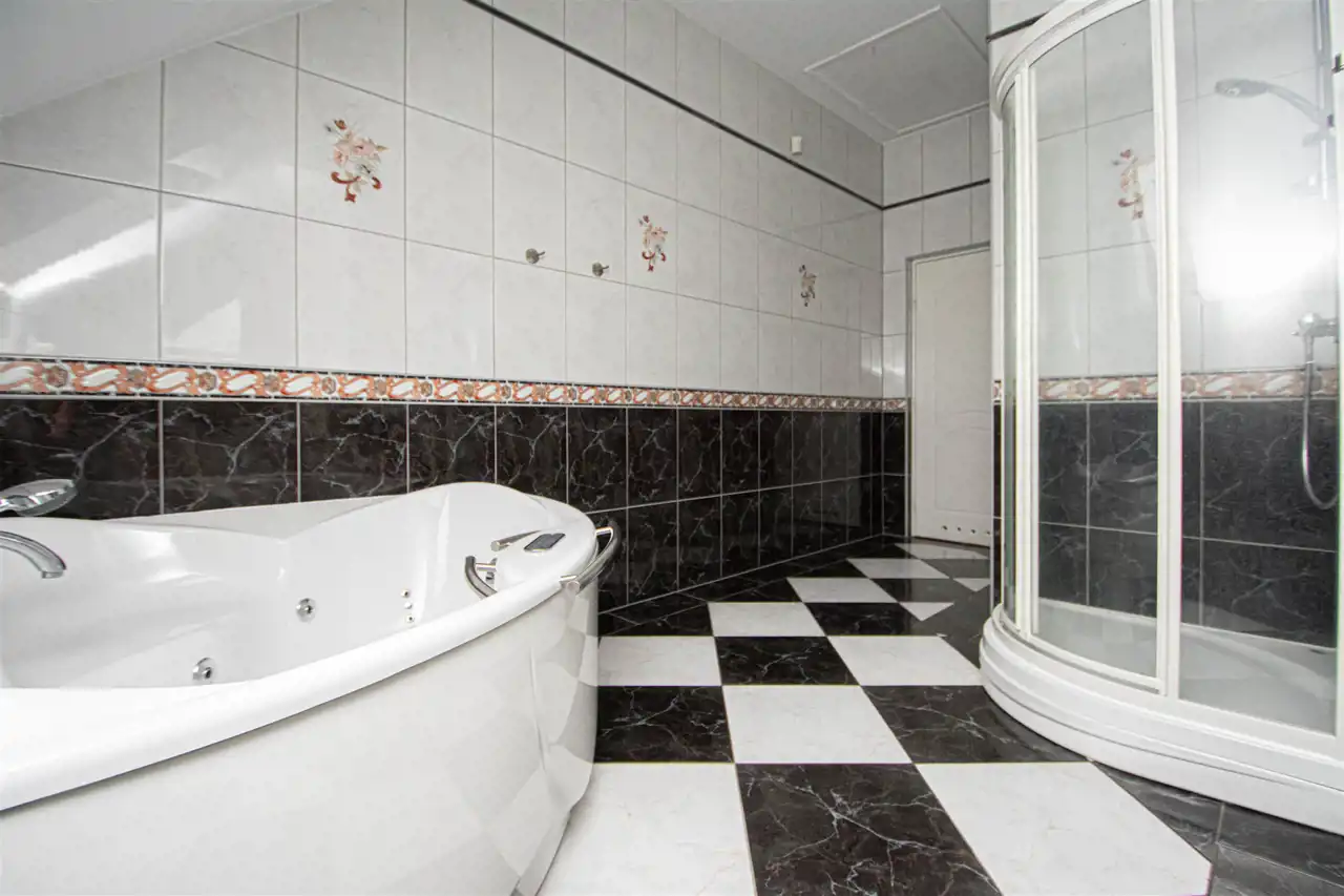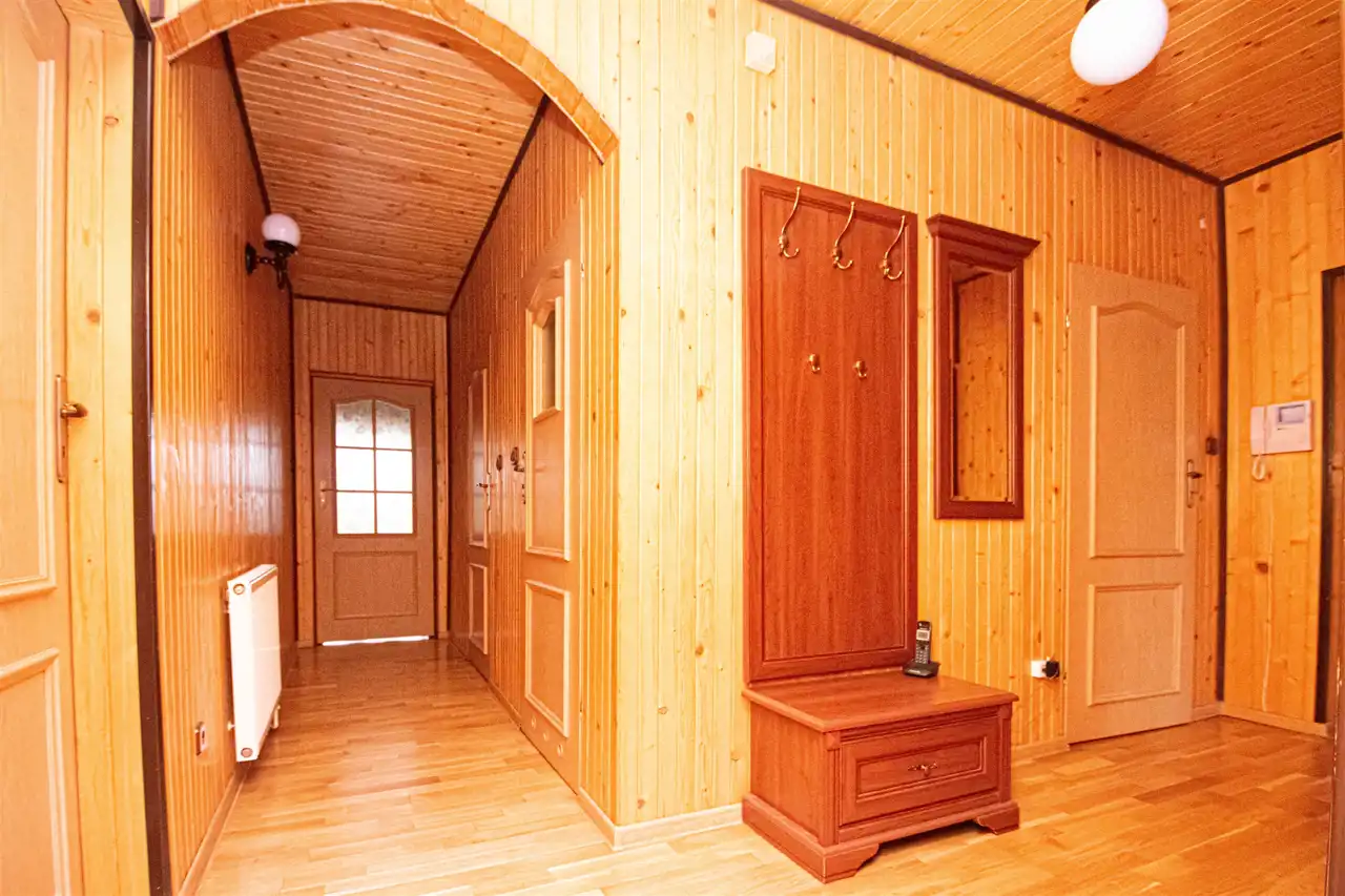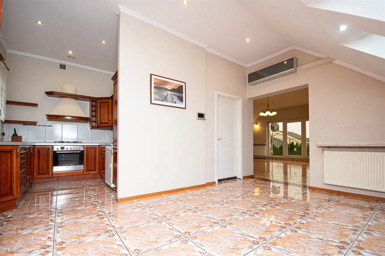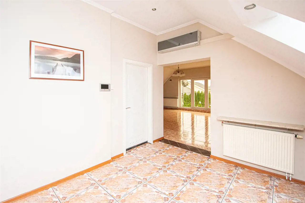 • Funkcjonalność i przestronność: Dom składa się z dwóch kondygnacji, co zapewnia optymalny układ pomieszczeń dla dużej rodziny. Na parterze znajduje się 5 pokoi z deską berlinecką na podłogach, garderoba oraz łazienka, a na piętrze dodatkowy przestronny salon, duża łazienka z jacuzzi oraz kuchnia z jadalnia.