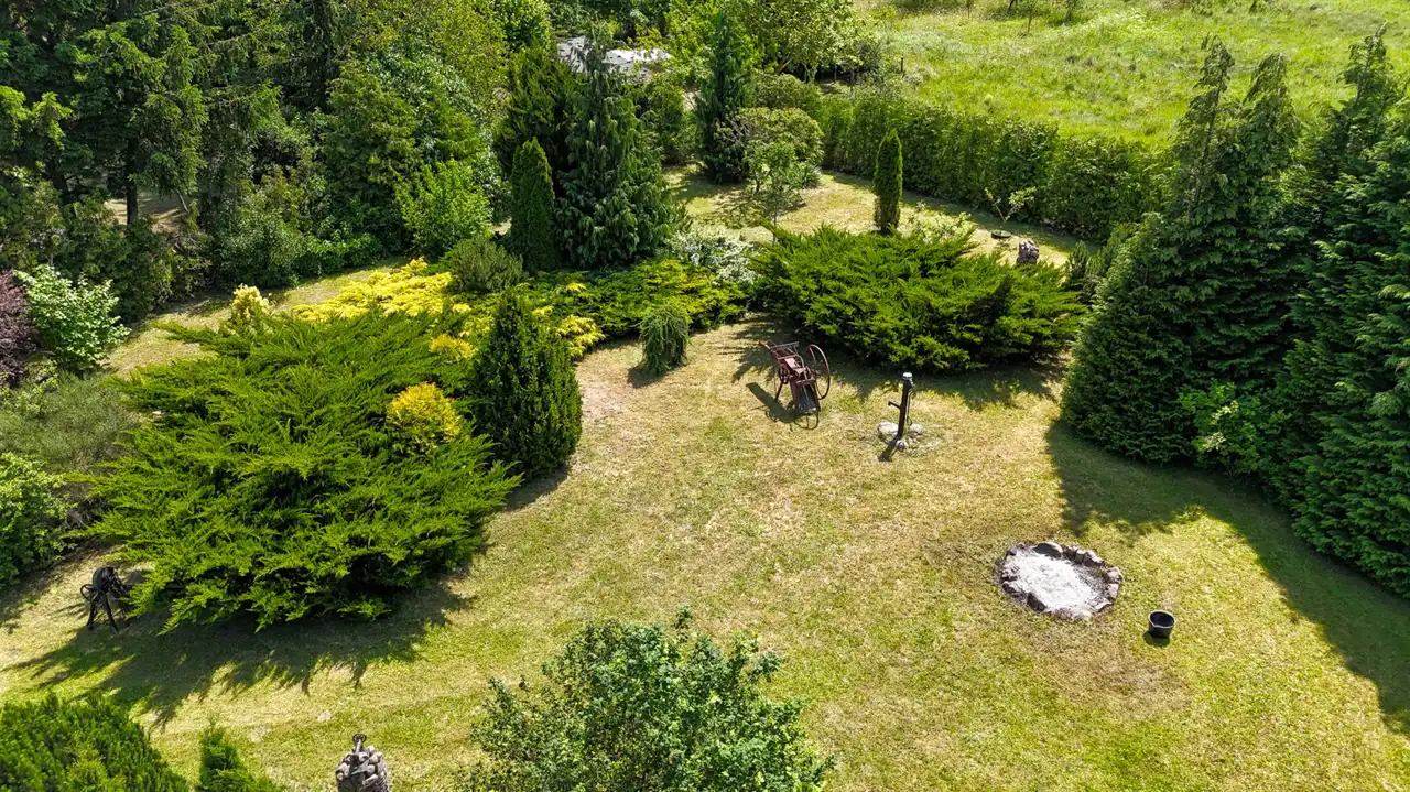 Ogród starannie zagospodarowany – podzielony na część użytkową (m.in. polbruk) oraz rekreacyjną z bujną roślinnością ozdobną, krzewami i drzewami owocowymi.