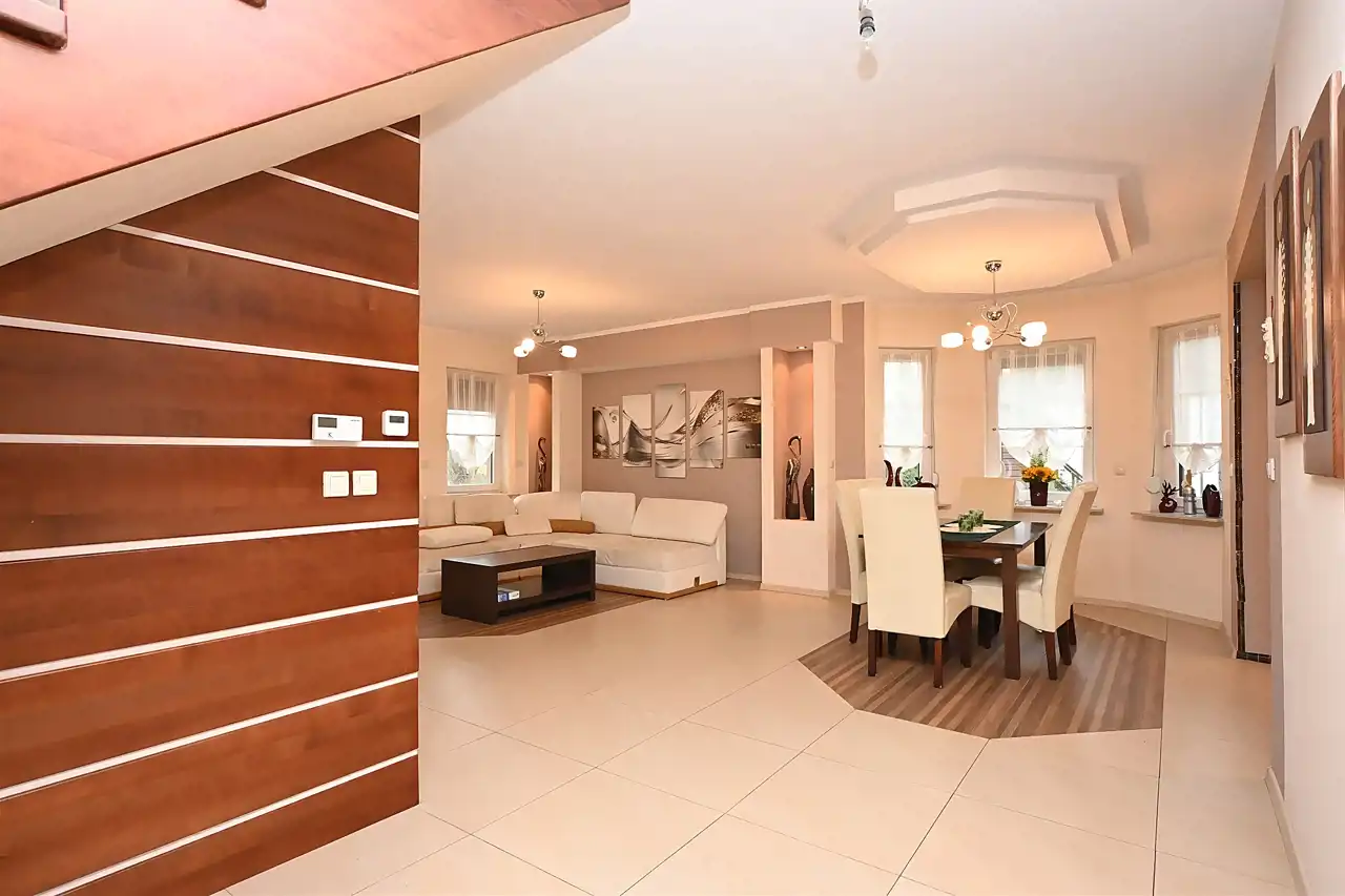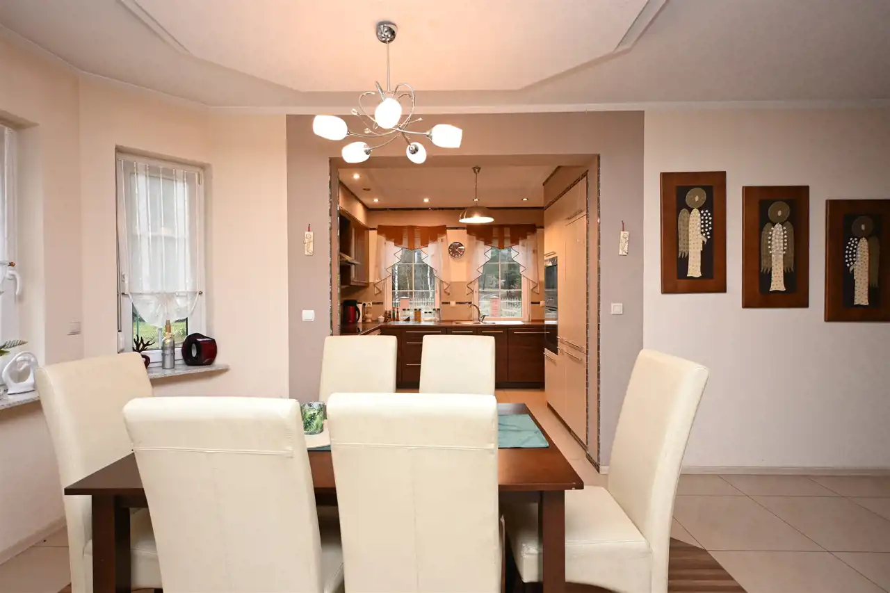 Nieruchomość o łącznej powierzchni użytkowej umożliwia komfortowe zagospodarowanie 7 funkcjonalnych pokoi, które można przeznaczyć zarówno na sypialnie, jak i gabinety, pokoje gościnne czy przestrzeń rekreacyjną. Dom został zaprojektowany z myślą o wygodzie, a jego układ zapewnia dużo naturalnego światła oraz poczucie przestrzeni.