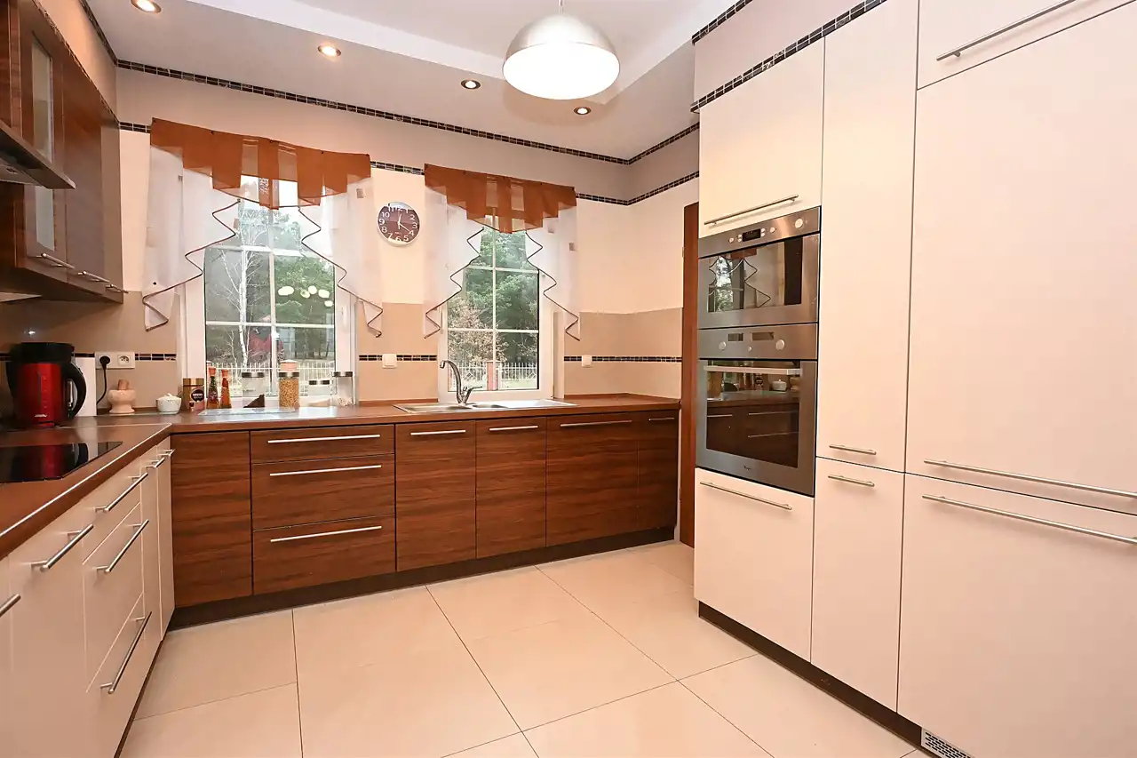 Kuchnia o pow. ok. 10m2 wyposażona we wszystkie sprzęty AGD. Przy kuchni spiżarnia, pow. ok. 2m2