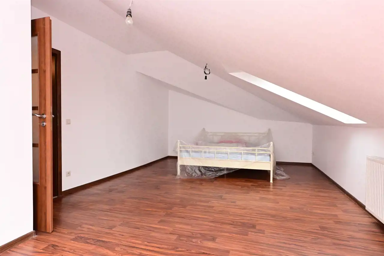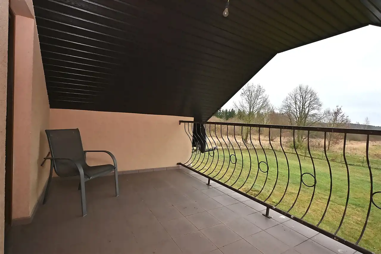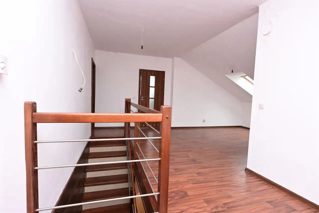 Na poddaszu znajdują się 4 niezależne duże pokoje. Z jednego z pokoi wyjście na duży balkon z którego rozpościera się widok na cała działkę
