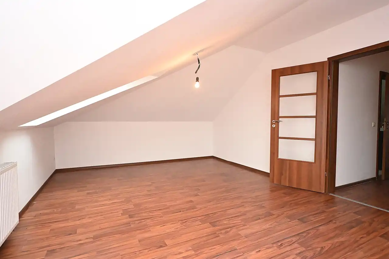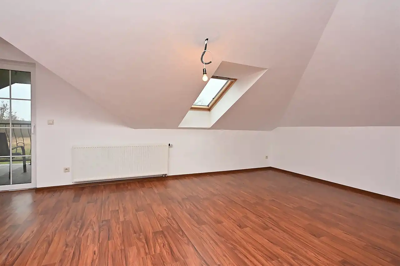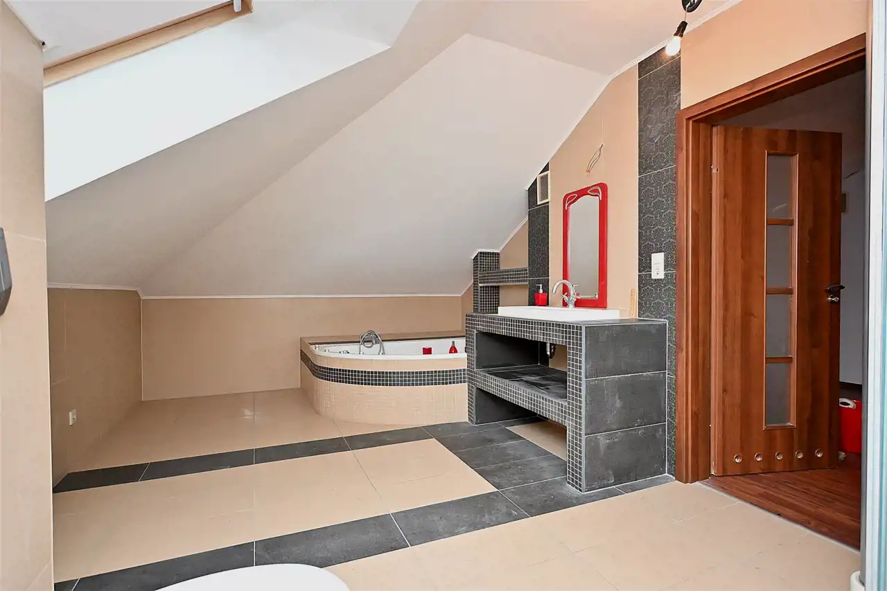 Na poddaszu znajdują się 4 niezależne duże pokoje. Z jednego z pokoi wyjście na duży balkon z którego rozpościera się widok na cała działkę