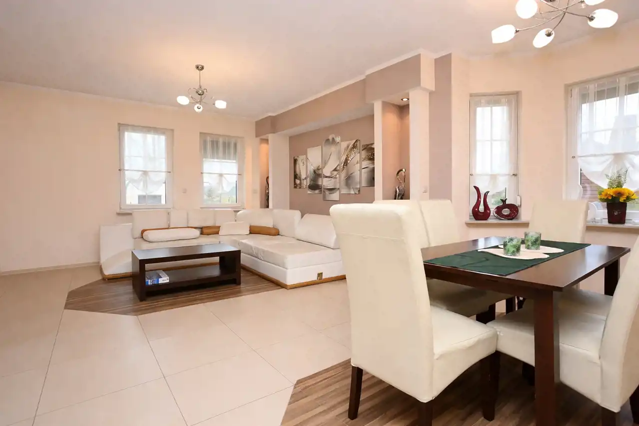 Dom oferuje komfortowy układ 7 funkcjonalnych pokoi, które można zaaranżować jako sypialnie, gabinety, pokoje gościnne